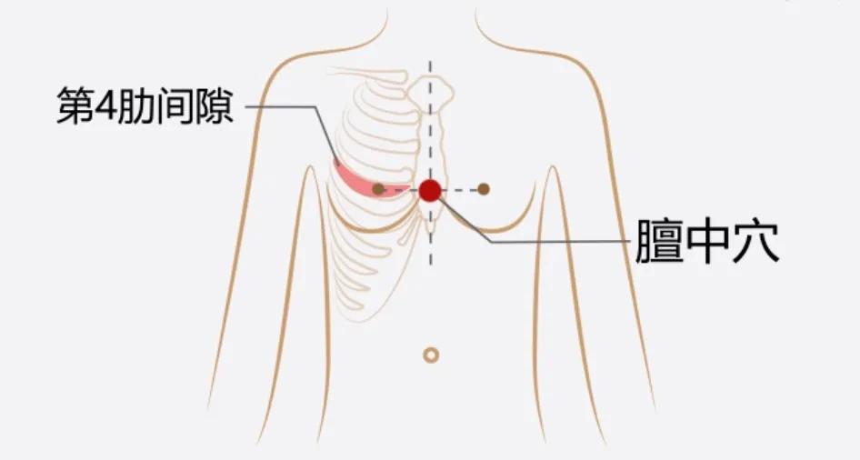 定位:仰卧位,由锁骨往下数,平第四肋间两乳头中点,前正中线上。