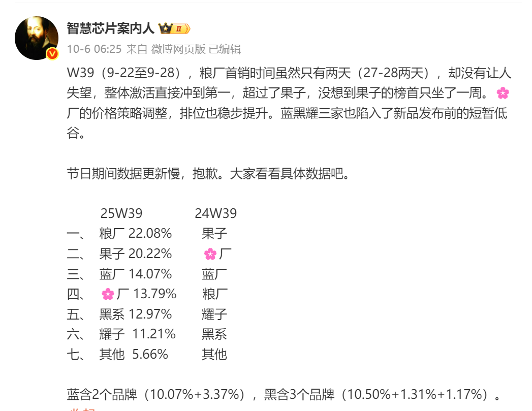 博主智慧芯片案内人公布第39周国内手机销量数据,小米两天首发期拿下冠军,具体排名如下