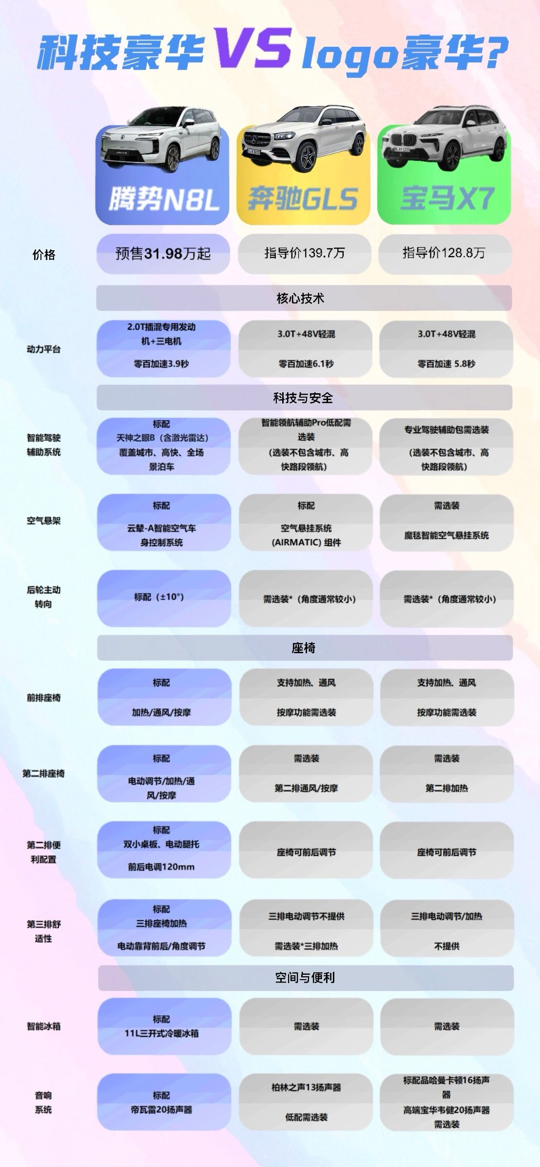 腾势 N8L真是完美诠释了什么叫:“传统豪华看logo,新能源豪华看科技呀,”众所周知咱国产新能源配置就是高,30万的腾势N8L不论从加速性能、还是操控、舒适、智能座舱等多方面体验都完爆传统豪华,30万级对标百万级奔驰GLS、宝马X7完全没问题。搭载辅助驾驶激光版的智驾就不说了,就连机械素质这块,传统豪华都没捞着一点好处,像“灵动如海鸥”的后轮转向、'稳如老狗”的云辇-A底盘,百万级传统豪华没有的,这次腾势N8L在30万级别就能统统配产。不得不说腾势这次真的诚意拉满了!