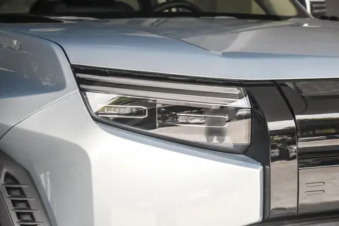 前脸采用封闭式黑色格栅设计,搭配平行排列的 LED 日行灯,宛如科幻片中机械眼般锐利,白天点亮时辨识度极高,老远就能一眼认出。下包围采用正梯形设计,内嵌银色装饰件,让硬派风格中多了几分精致感。前保险杠的斜面设计和底部护板不仅造型独特,实用性也很强,在郊外行驶时能有效阻挡飞溅的石子,保护车身不受损伤。
