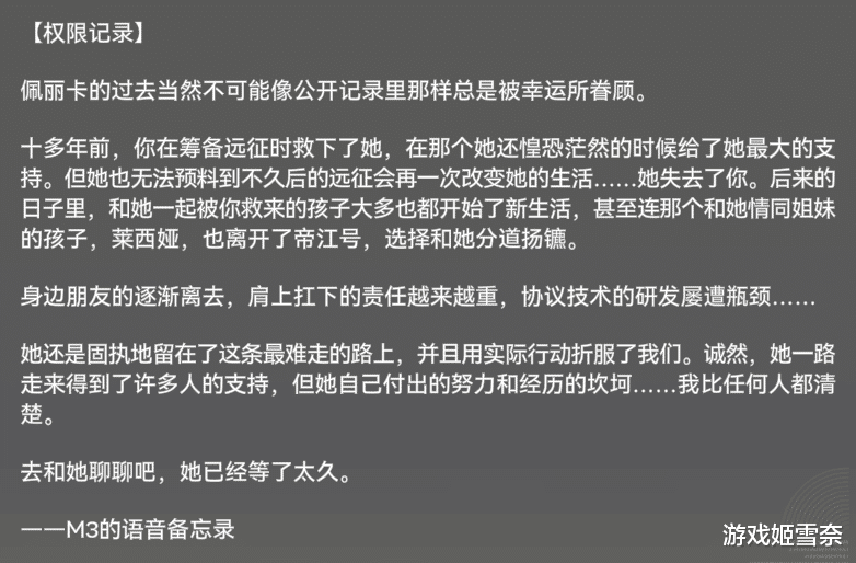 跟随佩丽卡的思绪回到过去,那时家园被天使入侵,小佩丽卡重伤在地一只眼都没办法睁开,另一眼看到的便是管理员伟岸的背影,被救回帝江号后这里成为了她的新家,在逐渐了解新环境后,M3姐姐给小佩丽卡换上了新衣服,管理员一句夸夸大拇指让佩丽卡记住了,这件衣服跟佩丽卡现在的颜色与穿搭方式一模一样,原来佩丽卡穿现在这件不是为了别的,是她知晓管理员这次醒来会失忆所以想要用这样的方式让管理员想起自己来啊。