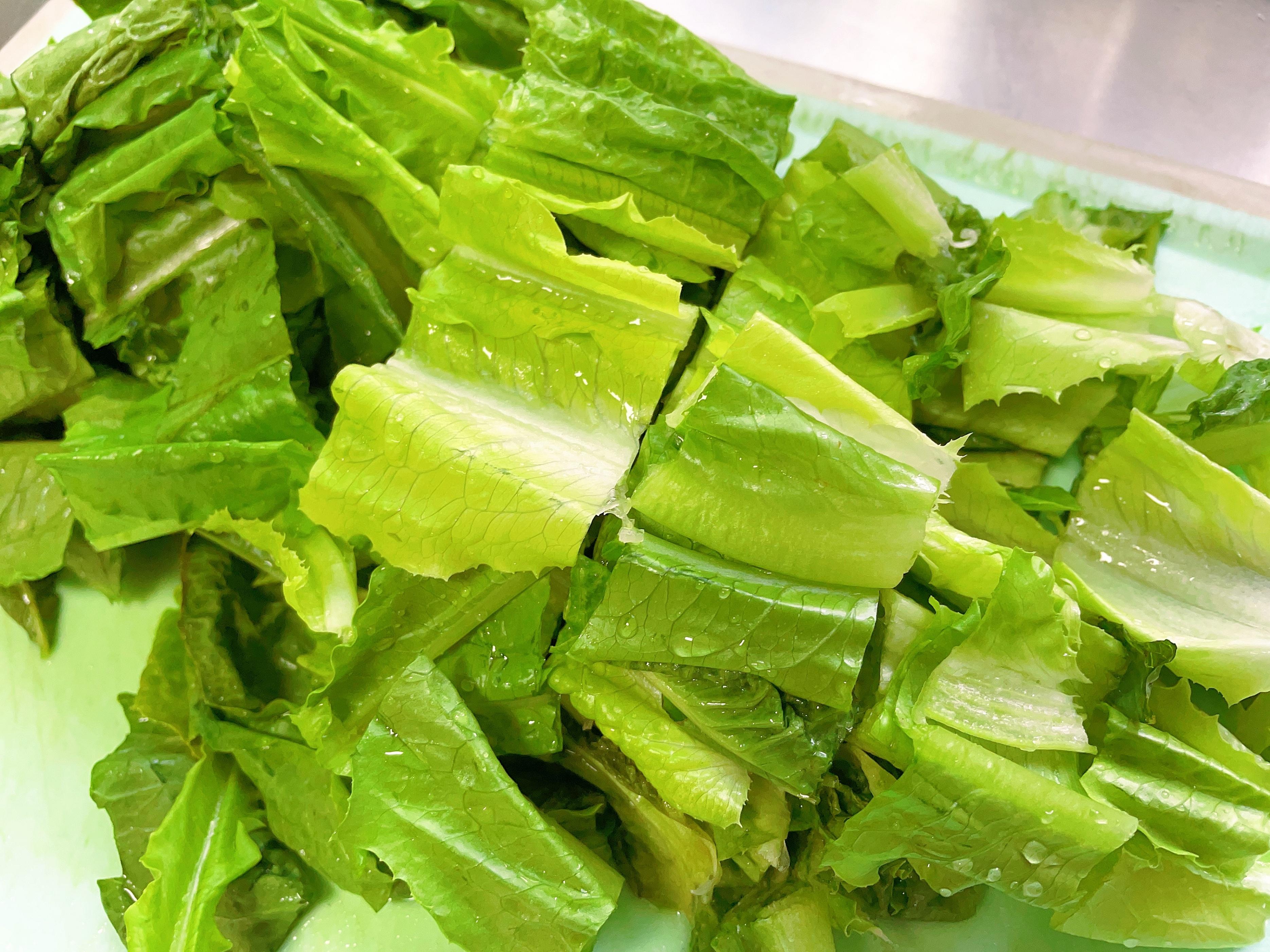 1、 油麦菜摘好叶子,清洗干净,切成自己喜欢的大小。