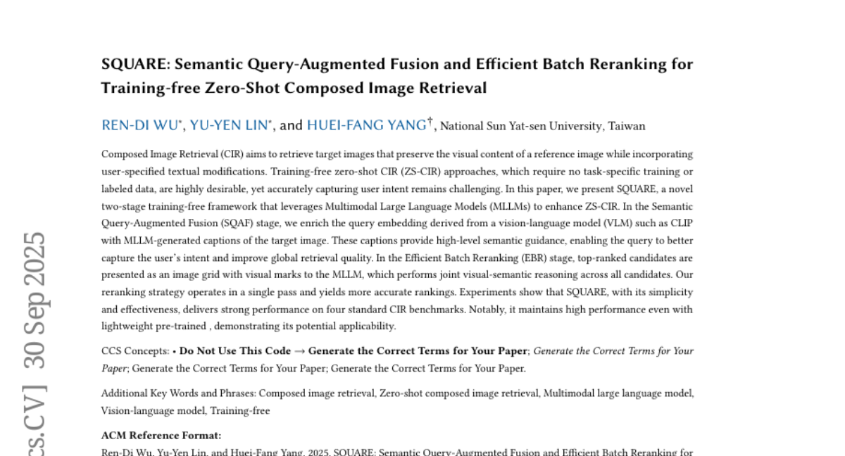 这项由台湾中山大学的吴仁迪、林余晏和杨慧芳领导的研究团队发表于2025年8月的期刊文章,提出了一种名为SQUARE的全新图像检索框架。有兴趣深入了解的读者可以通过论文编号arXiv:2509.26330v1查询完整论文。