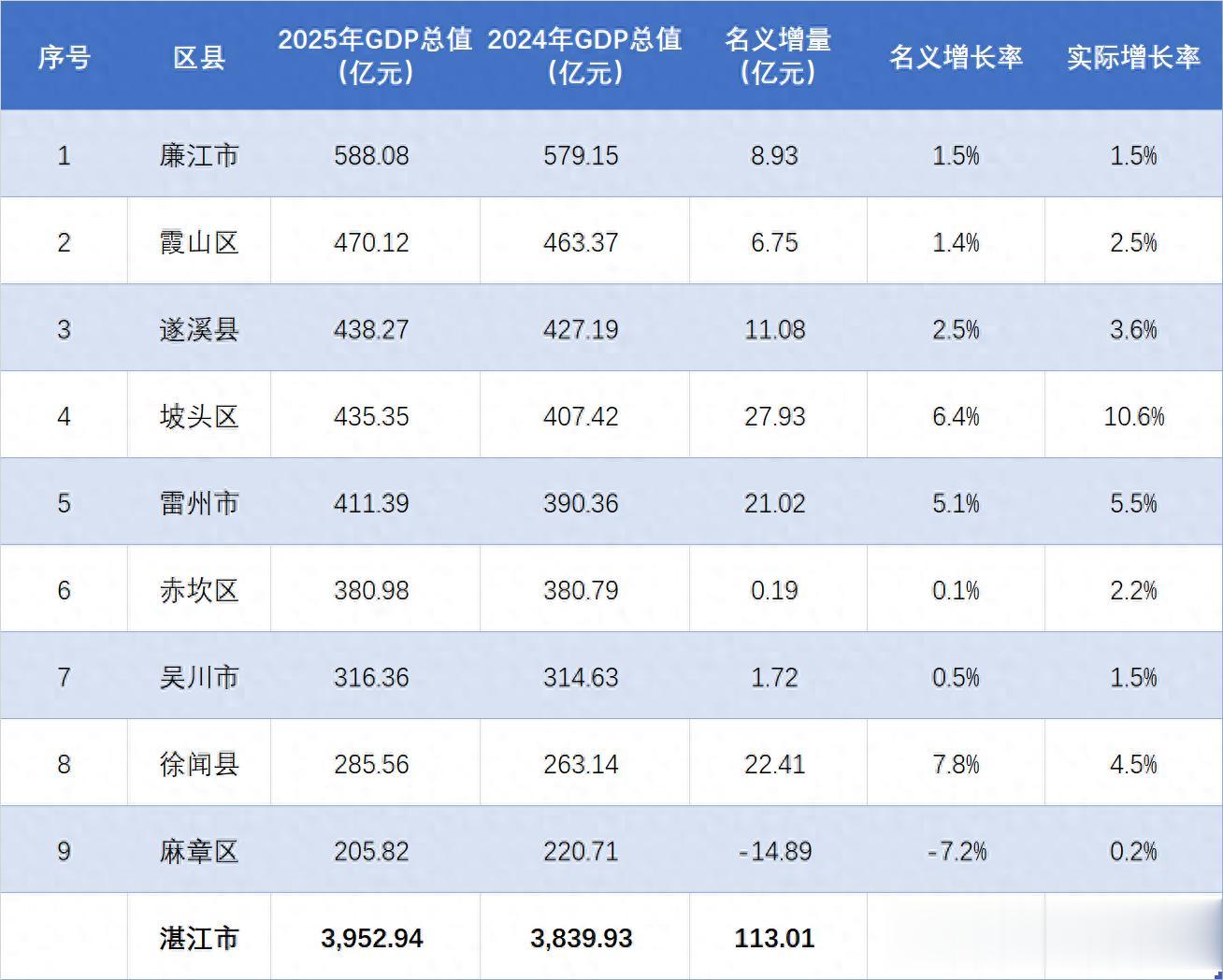 除前述五地外,湛江市其他区县2025年GDP总值都不足400亿元。其中赤坎区和吴川市总量相对较高,累计金额都在300-400亿元之间,分别为380.98亿元和316.36亿元。不过从同比来看,两地表现均属一般,名义增长率都不足1%,分别只有0.1%和0.5%,在各地之中已是倒数,接下来能否尽快走出低迷,尚有待进一步观察。