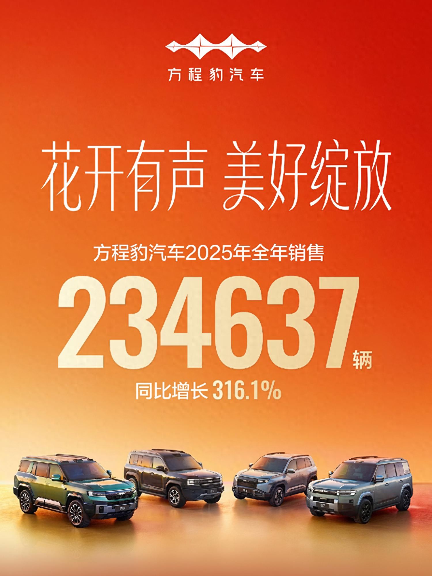 2025年方程豹品牌势能全面爆发,全年累计销量突破234637台,同比暴涨316.1%;品牌累计销量超29万台,品牌成交均价23.4万元,高价位、高配置为主销版本,实现“量价齐升”的高质量增长!