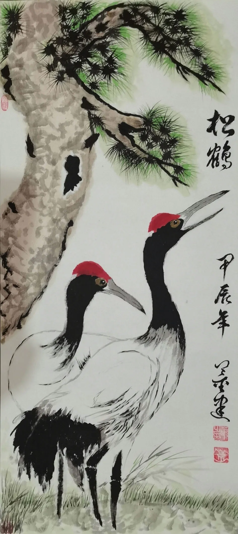 在绘画方面,董建先生同样展现出全面的修养。《旭日东昇》一图,构图简练而意蕴深远。苍松虬劲,以墨色浓淡干湿表现出树干的质感与空间的层次;一轮红日喷薄而出,色彩鲜明而不艳俗,与墨色松石形成强烈对比,生机勃勃之意跃然纸上。而《松鹤》图则尽显传统文人画的吉祥寓意与高雅格调。双鹤姿态优雅灵动,刻画精细;松树苍翠挺拔,松针攒簇有致。画面以留白营造空灵之境,设色清雅,鹤之白、顶之红、松之绿相映成趣,共同烘托出宁静祥和、松鹤延年的美好意境,体现了作者对自然生命的深切观照与对传统美学精神的精准把握。