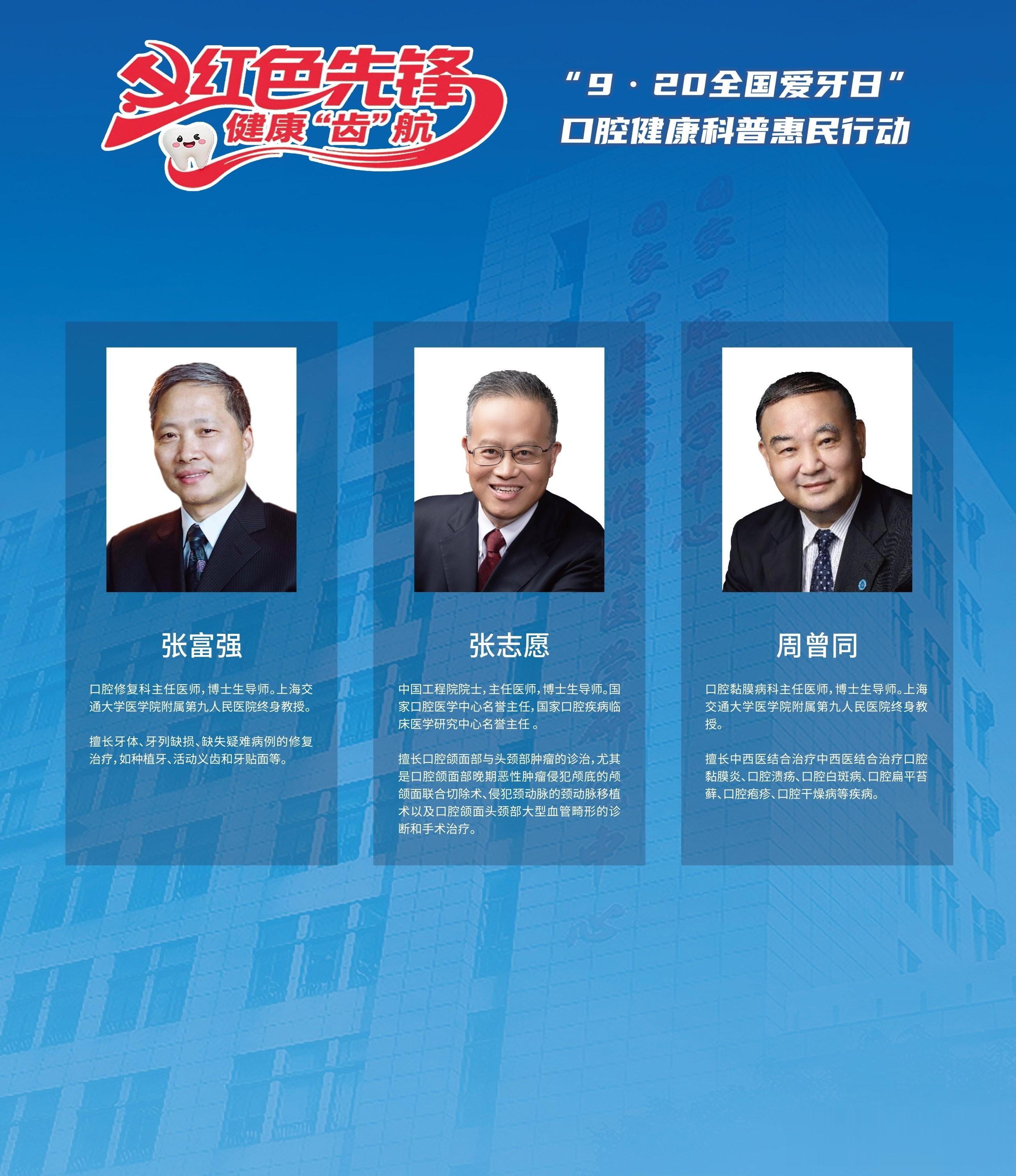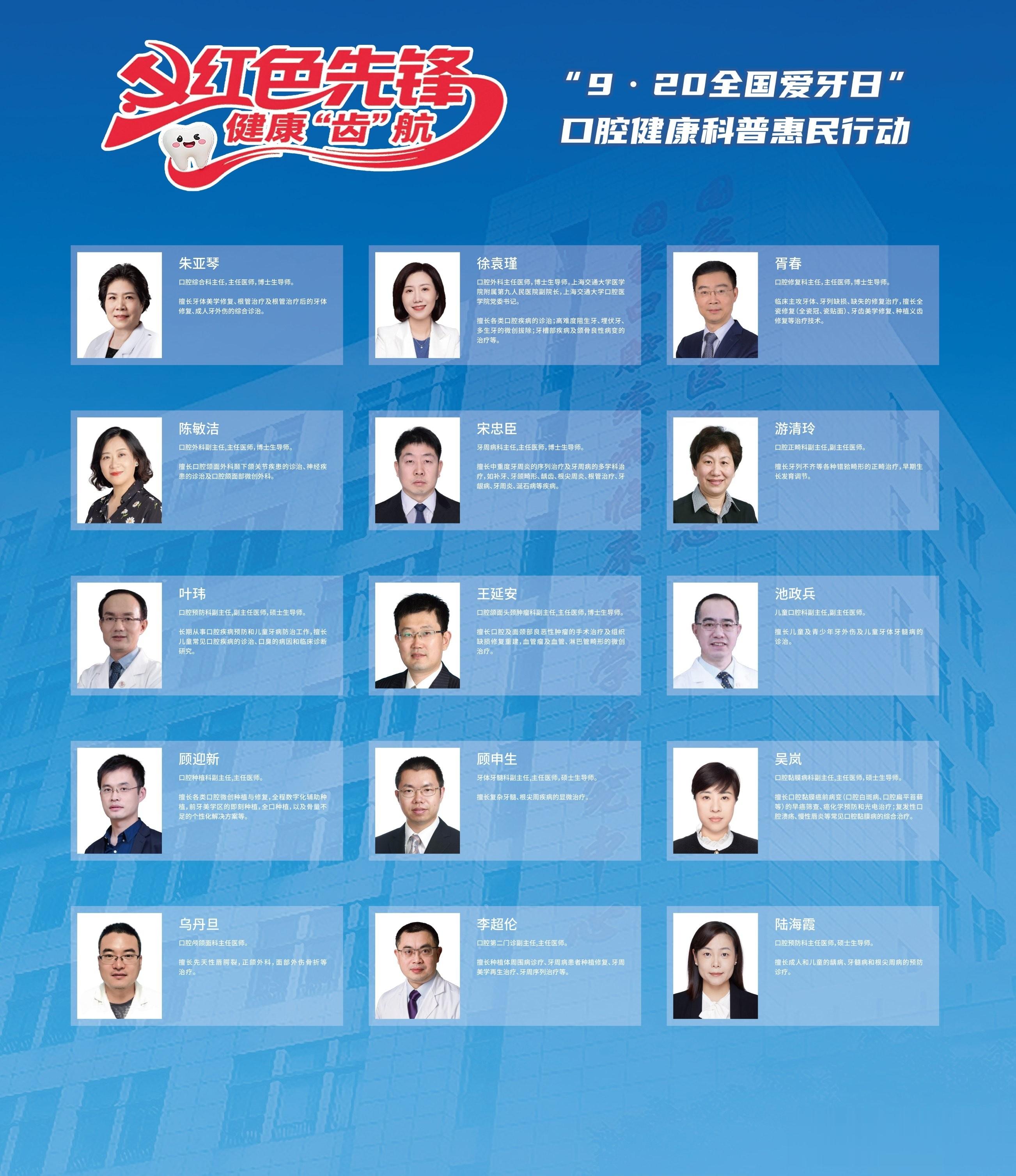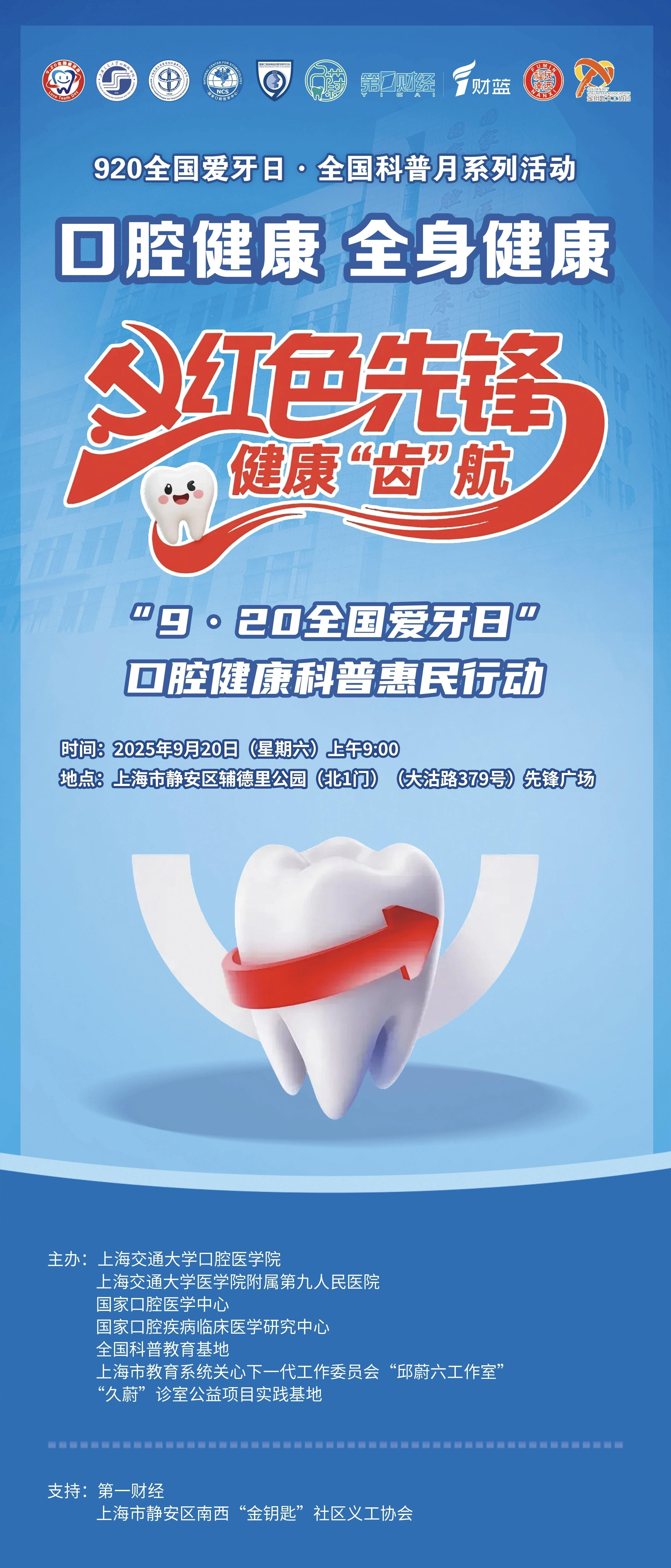 ♥“专家面对面,健康零距离”♥。2025 年9月20日(星期六)上午9:00地点:静安辅德里公园(北1门)(大沽路 379 号)先锋广场,由中国工程院院士张志愿教授领衔,携手上海交通大学医学院附属第九人民医院口腔各科室18位资深专家,现场为市民提供专业的口腔健康咨询服务。