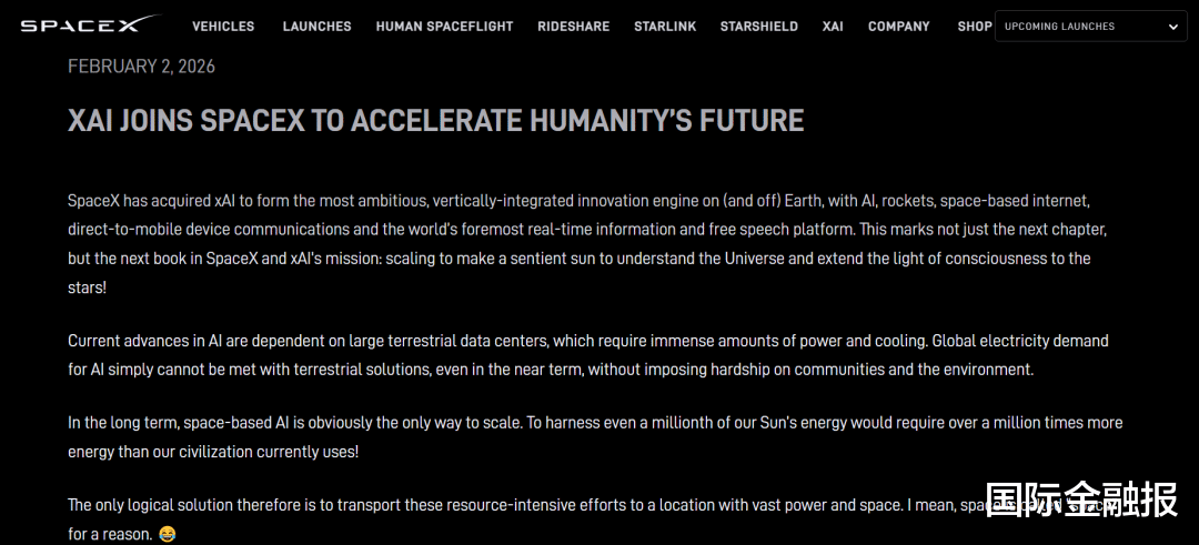 SpaceX随后确认了这一交易,并在官网发布了马斯克向公司内部发送的一份备忘录。马斯克在备忘录中表示:“SpaceX已收购xAI,旨在打造地球内外最具雄心、实现纵向一体化的创新引擎。”目前,马斯克同时担任SpaceX与xAI的最高管理者。