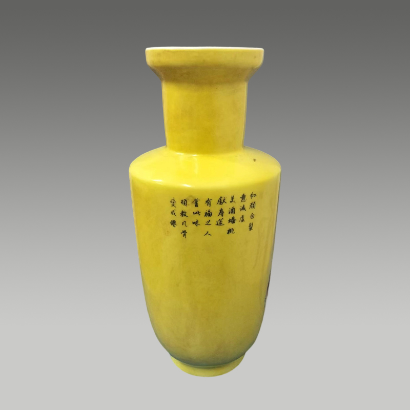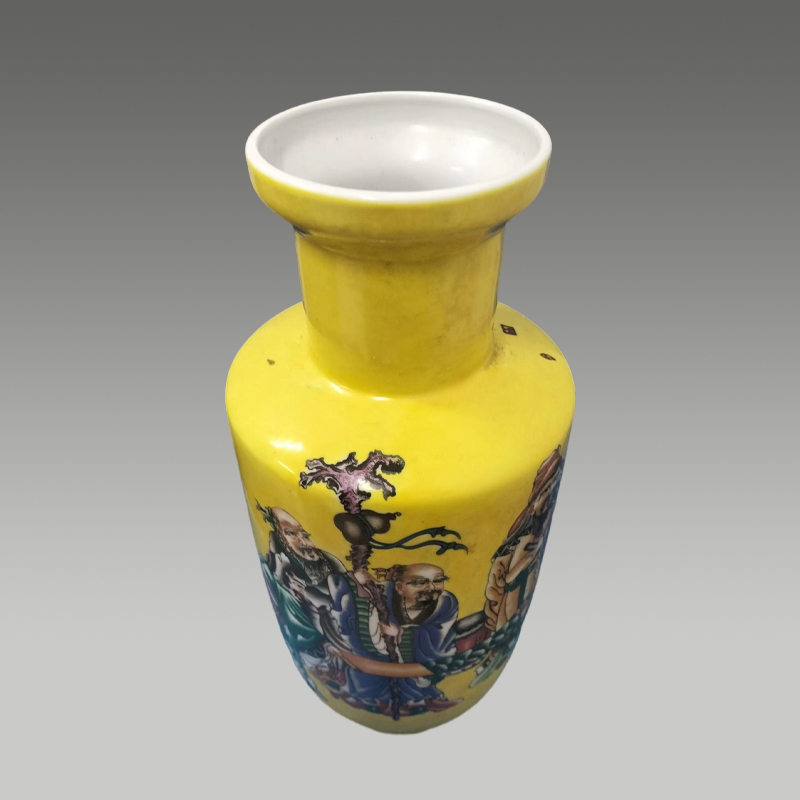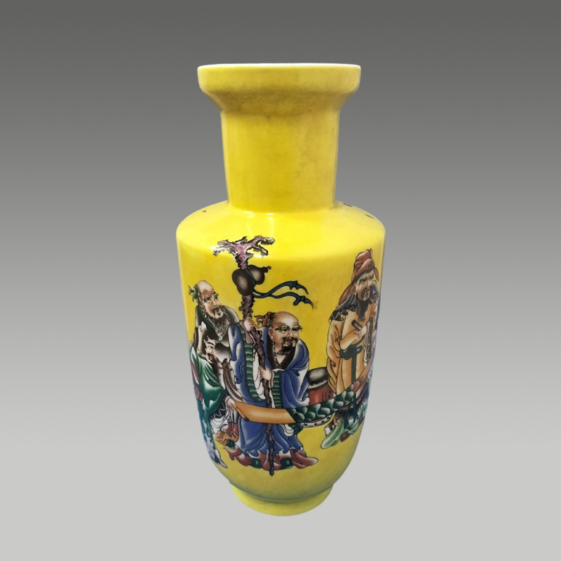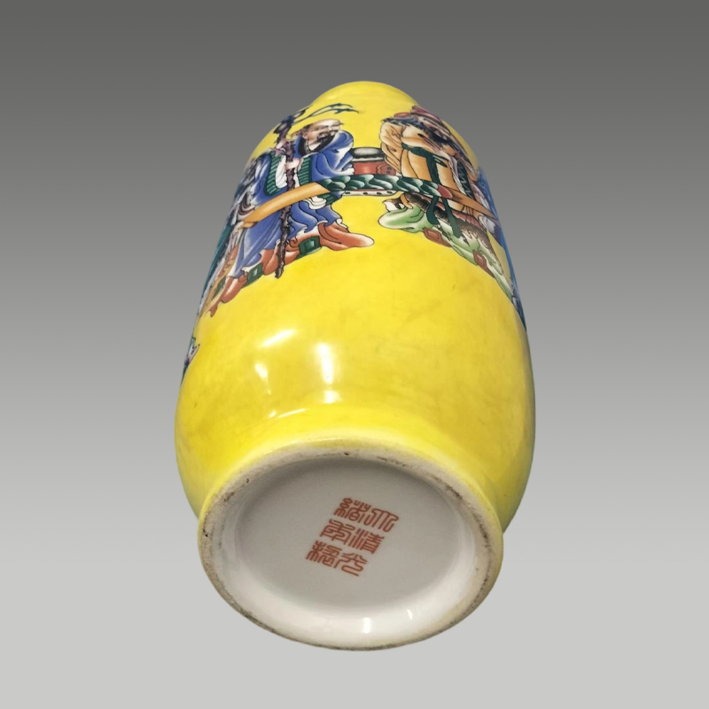 本件藏品以黄色釉为底色,搭配彩色工艺,绘制人物图案,色彩对比鲜明,视觉效果华贵,存世量极为稀少