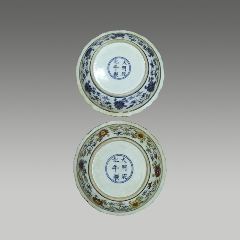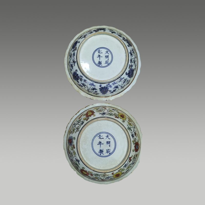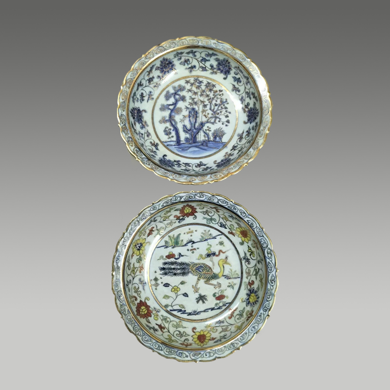 此组藏品花口造型,口沿呈花瓣状,线条柔美,盘心绘有凤凰,山水树纹样,具有一定的珍藏价值