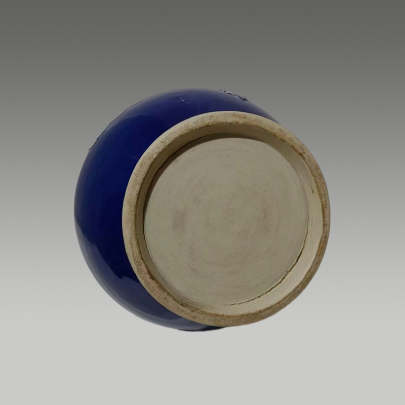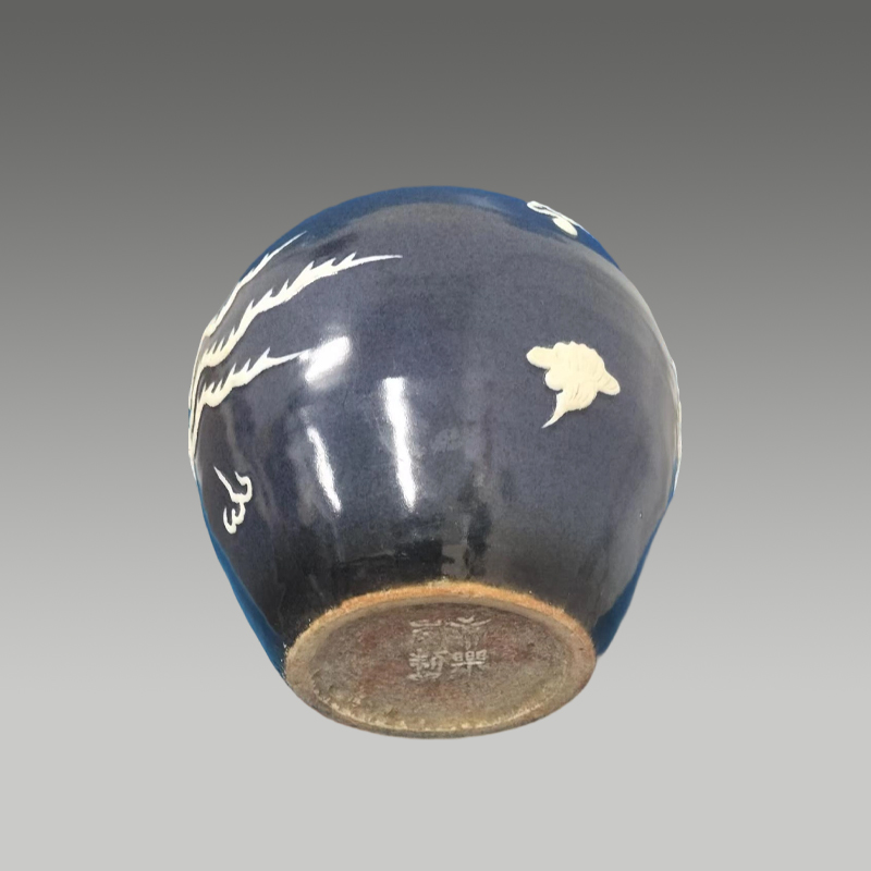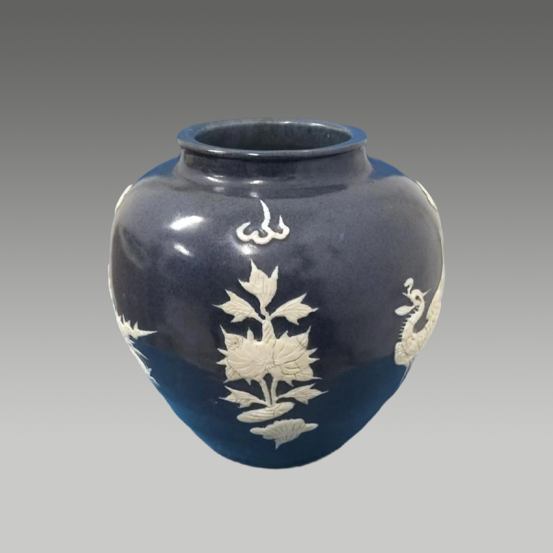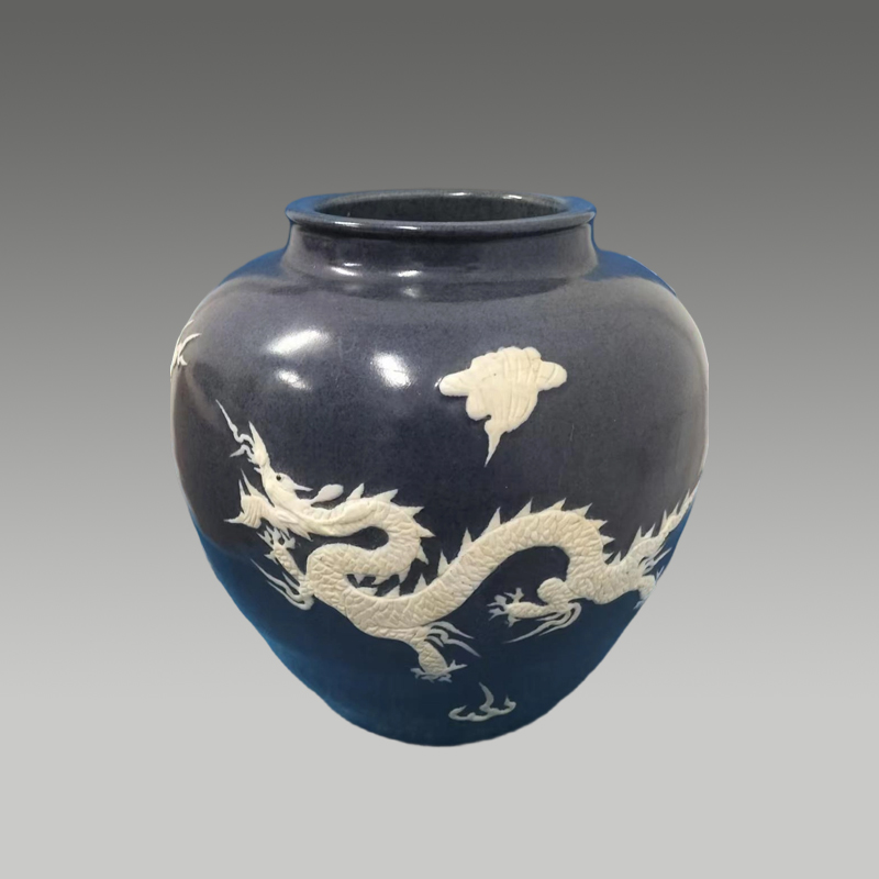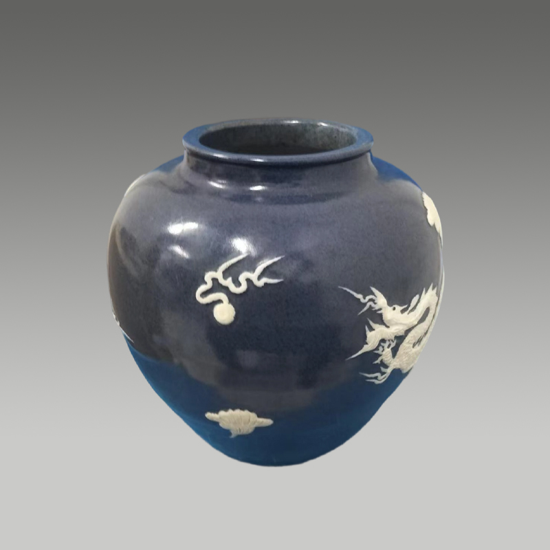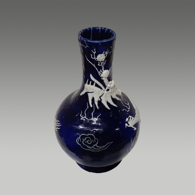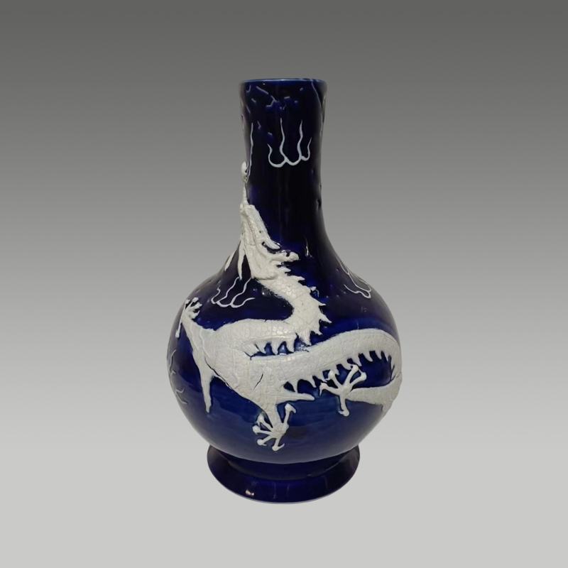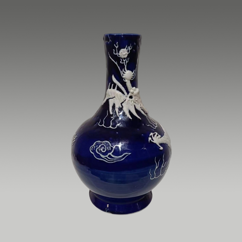 霁蓝釉堆雕白龙纹天球瓶,霁蓝莹润,白龙堆雕灵动,工艺精妙,纹饰鲜活,收藏与艺术价值俱佳
