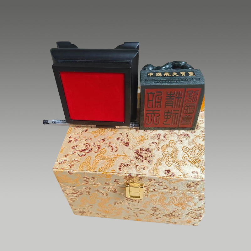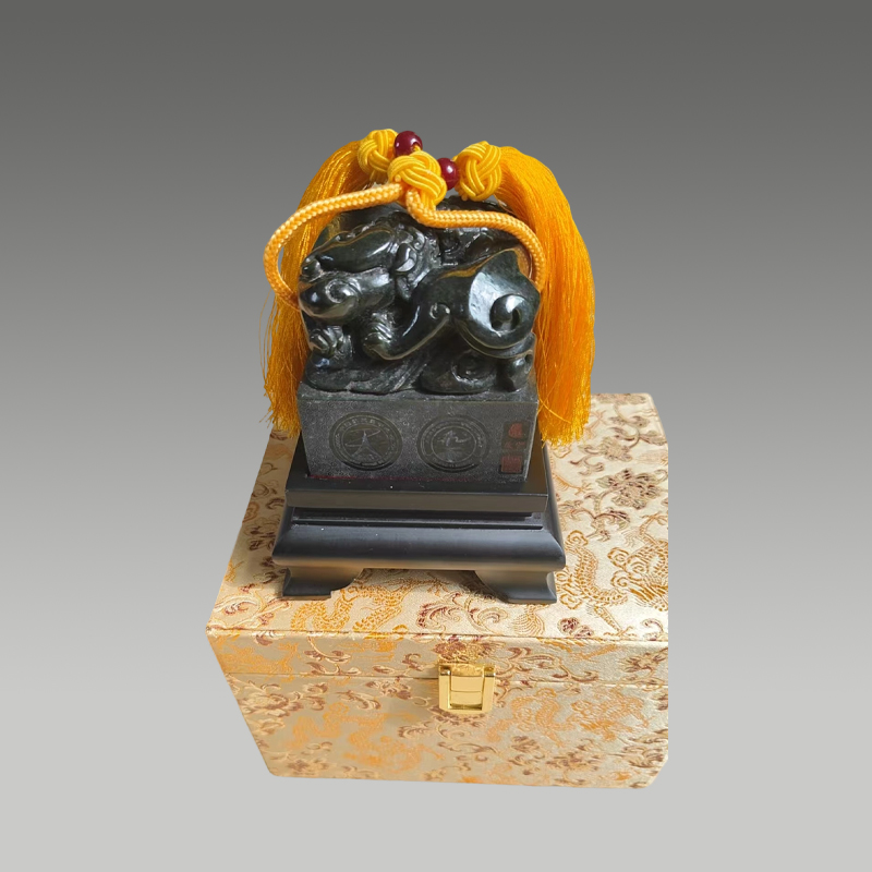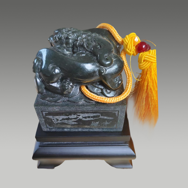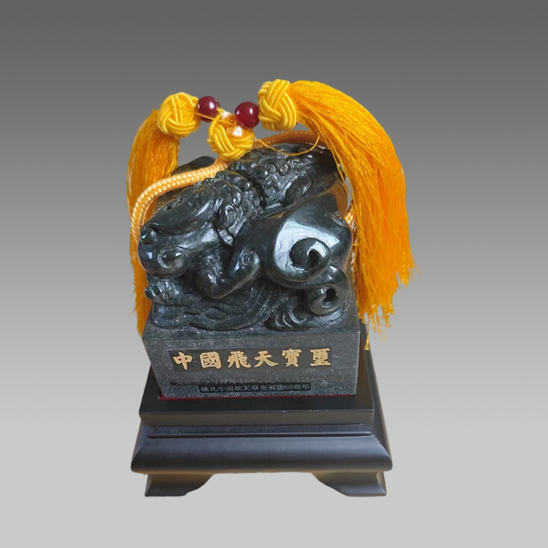 采用和田青玉精雕而成,玺基表面雕刻云纹、玺钮雕刻两条螭龙盘旋成太极图案,呼应“天圆地方”