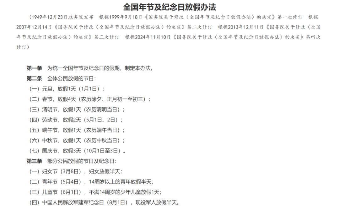 根据该《办法》,部分公民放假的节日及纪念日有以下4个: