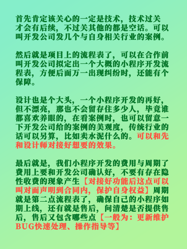 最后就是,我们小程序开发的费用与周期了费用上要和开发公司确认好,不要有存在隐性收费的现象产生【对接好功能后这点可以叫对面声明到合同内,保护自身权益】周期就是第二点流程表了,确保自己的小程序如期上线,还有就是售后,问清楚是否提供售后,售后又包含哪些点【一般为:更新维护bug快速处理、操作指导等】