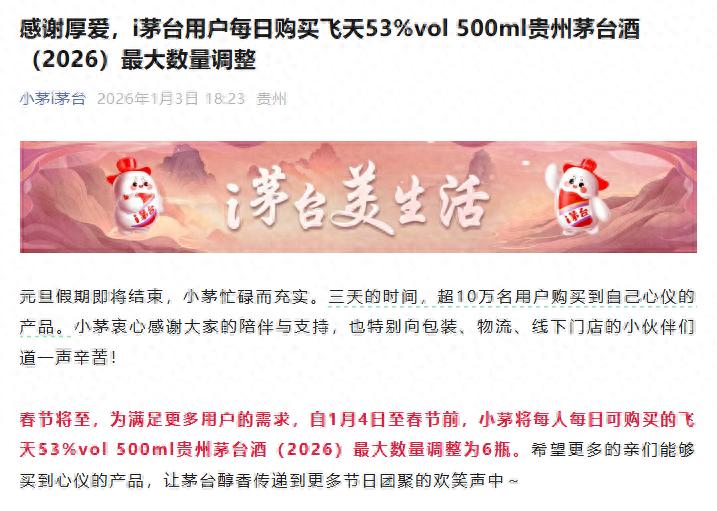 1月3日晚间,贵州茅台“小茅i茅台”发布最新消息称,春节将至,为满足更多用户的需求,自1月4日至春节前,小茅将每人每日可购买的飞天53%vol 500ml贵州茅台酒(2026)最大数量调整为6瓶。