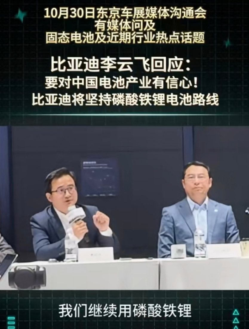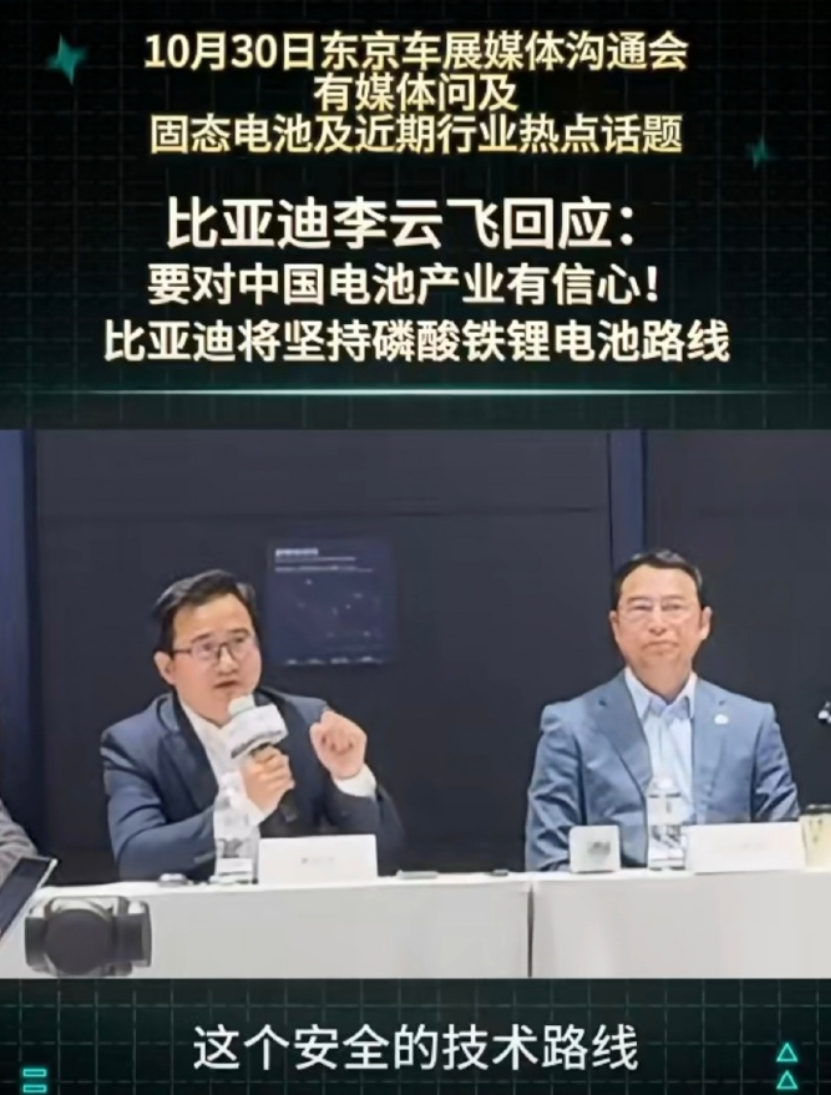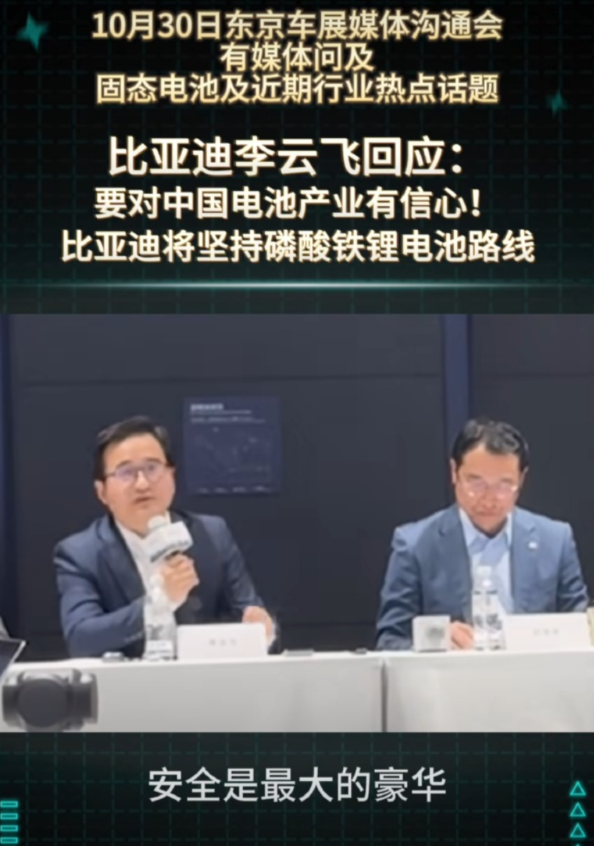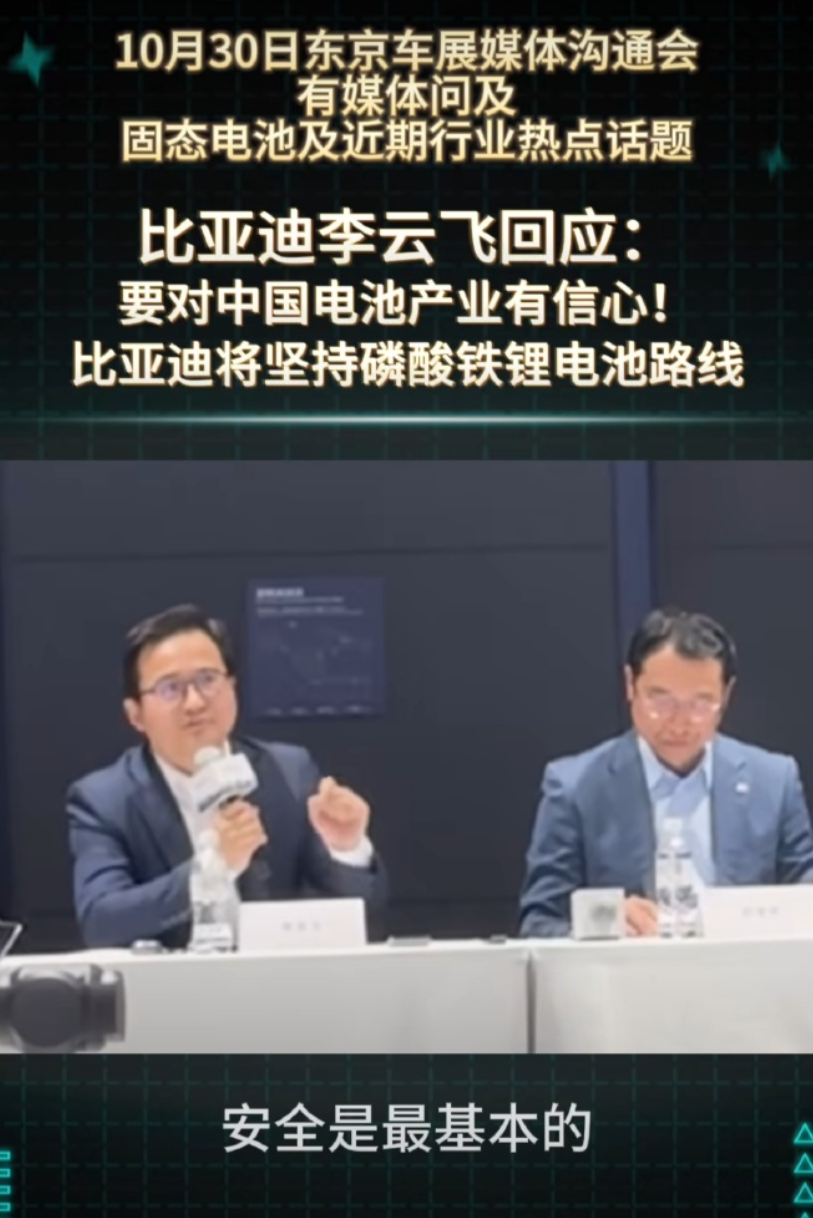 促进动力电池行业发展!当行业追逐更高续航时,比亚迪选择了一条更"沉"的路——坚持磷酸铁锂。东京车展沟通会上,比亚迪李云飞直接亮明态度——深耕磷酸铁锂技术,以安全为底、创新为劲,拉着行业一起促进动力电池行业发展!每一次电动车燃烧事故,消费者记住的是"电动车不安全",一个品牌的事故,需要整个行业共同买单。十五年,中国50多万辆电动公交车,搭载磷酸铁锂电池,零恶性燃烧事故。这是技术路线的胜利,更是对生命的尊重。大巴上坐的是50条生命,私家车载的是2-6个家庭,安全没有等级之分。"安全是最大的豪华",这不是口号。当磷酸铁锂市场份额突破80%,成为绝对主流时,我们欣慰行业正回归理性。比亚迪重申:在售及未来所有车型,继续坚守磷酸铁锂路线。续航很重要,但活着才有里程。呼吁同行:不要为了数据,丢了底线。做加法,不做赌注——这是比亚迪作为行业一份子的责任与期盼。