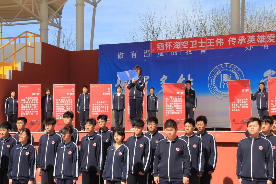 2026年4月1日,在海空卫士王伟烈士逝世25周年之际,北京市博文学校隆重举行缅怀纪念活动,全体师生以庄重仪式追忆英雄、致敬忠魂,传承英烈精神,厚植家国情怀。