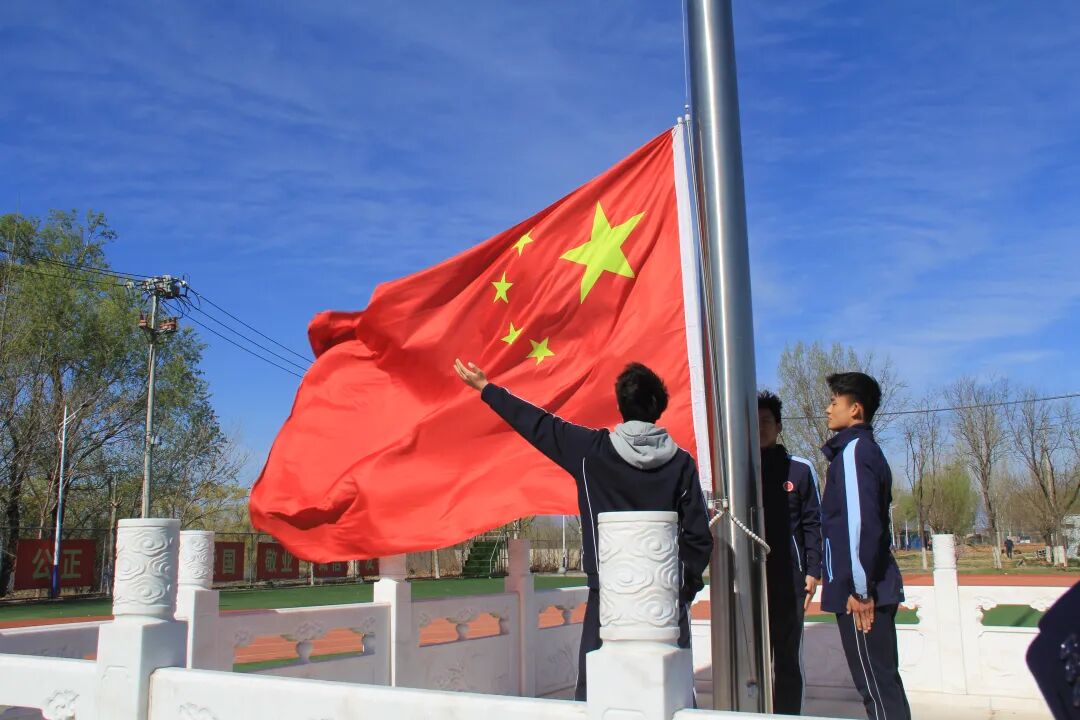 全体师生整齐列队,升国旗、奏唱国歌,目光坚定、神情肃穆;