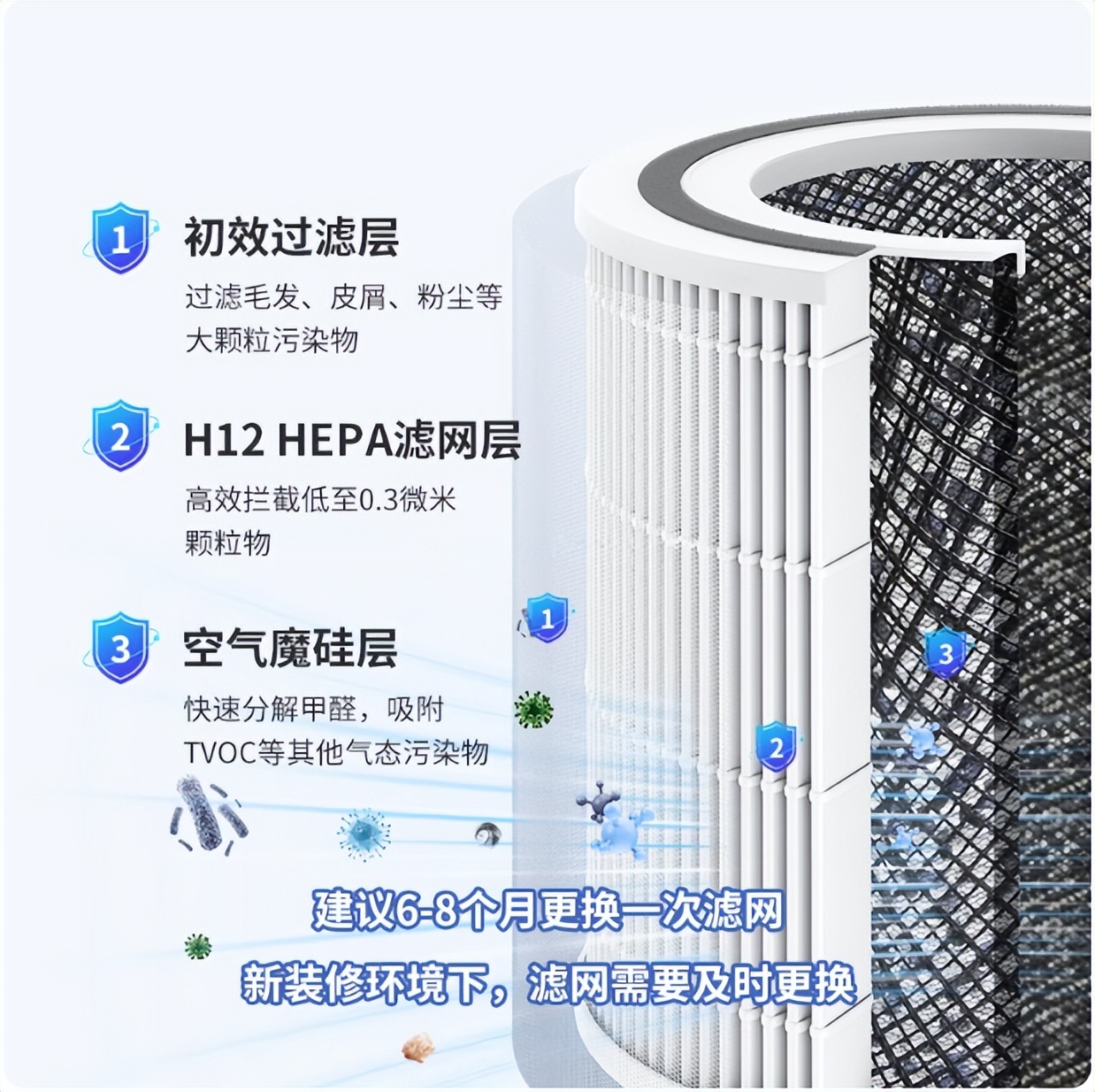 滤网更换便捷:复合滤网更换无需工具,打开顶部盖板就能取出,且滤网密封性好,更换时不会有粉尘、毛发漏出,避免二次接触过敏;