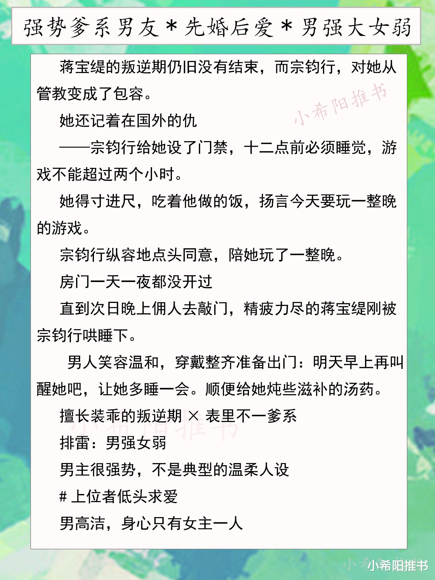 婚后男主从所谓的管教变成包容,蒋宝缇的叛逆在他织就的温柔网中,变成了夫妻情趣。 男主典型的爹系男友,但没有所谓的爹味,上位者为爱低头,这一点还是比较好嗑的!