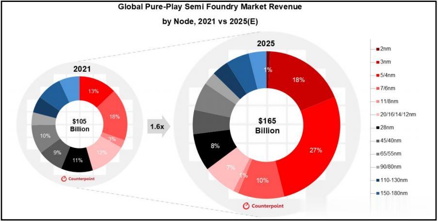 根据CounterpointResearch数据,全球纯半导体晶圆代工行业的收入将在2025年同比增长17%,超过1650亿美元,其中,2nm节点收入约为15亿美元,占比1%;3nm节点收入约为300亿美元,占比18%;5/4nm节点收入约为450亿美元,占比27%;7/6nm节点收入约为165亿美元,占比10%。包括7nm在内的这些先进节点收入合计为930亿美元,在2025年贡献纯晶圆厂总收入的一半以上(56%)。