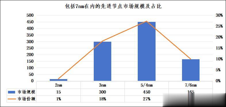 基于CounterpointResearch的细分节点市占率数据测算,台积电在先进制程(7/6nm及以下,含2nm)领域的收入规模与市场地位可明确量化:在7/6nm、5/4nm、3nm及2nm各节点中,台积电分别占据65%、85%、95%的市场份额,据此核算其先进节点总收入规模达789亿美元,对应全球先进制程市场整体份额约85%,持续保持绝对主导地位。在7/6nm先进制程领域,中芯国际当前仅占据5%的市场份额,对应该节点收入规模约8亿元,这一收入在全球先进制程(7nm及以下,含2nm)整体收入中的占比仅为1%——中芯国际在高端制程领域仍处于初步突破阶段。