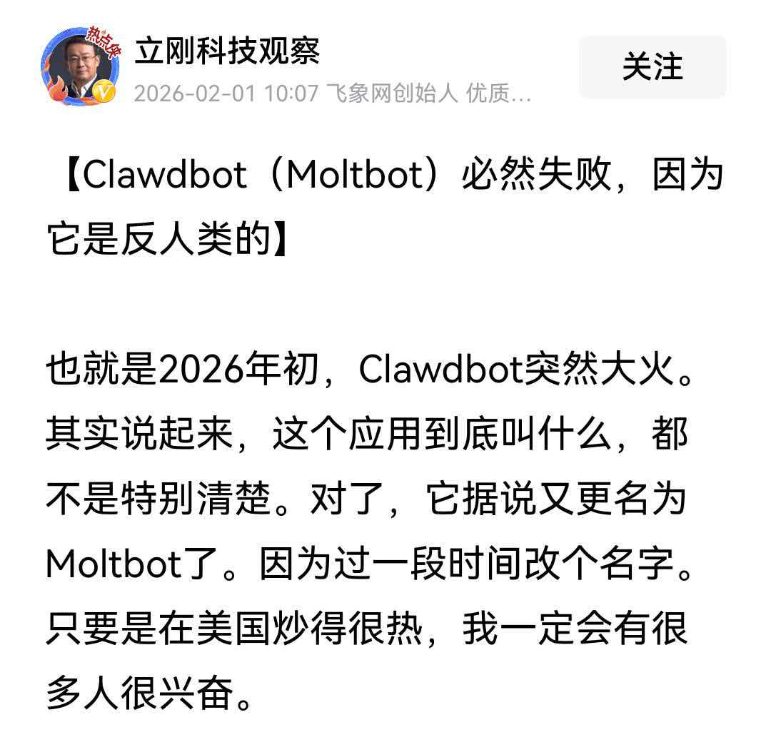突然刷到一个大V,旗帜鲜明地说明龙虾机器人必然失败。