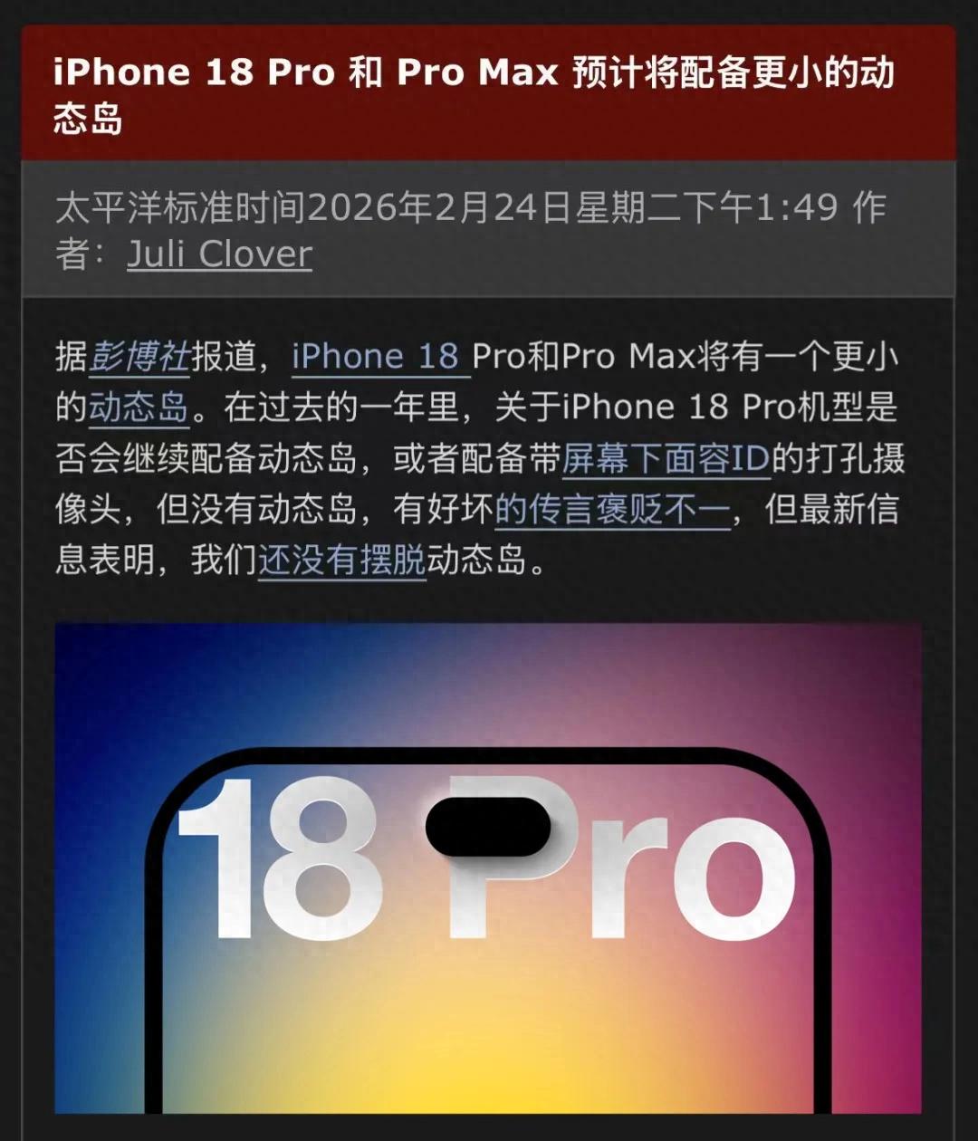 近日,彭博社报道称,结合多位爆料者的消息,苹果并不会为iPhone 18 Pro系列改用单挖孔,而是采用了缩小版的新“灵动岛”。