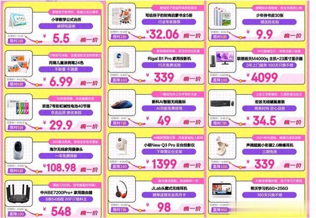 其中,海尔无线家用摄像头限时6折,中兴BE7200Pro+家用路由器低至548元,Rigal B1 Pro家用投影仪降至339元,小明New Q3 Pro云台投影仪降至1399元;新科AI智能无线鼠标限时7折,到手价49元;LAB头戴式无线耳机降至98元;联想扬天M4000q主机+23英寸显示器降至4099元;宏碁无线键鼠套装限时7折到手价34.5元;声阔超能小彩蛋2.0聒噪耳机降至339元,还有希沃学习机6G+256G版本直降900元,到手2999元。