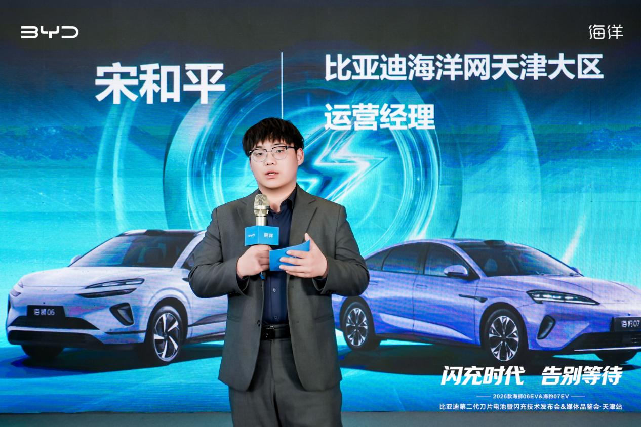 在上市发布会现场,比亚迪海洋网天津大区运营经理宋和平先生在致辞中表示:此次上市的新车首搭第二代刀片电池与兆瓦闪充技术,实现全场景高效补能:无论常温还是低温环境,都能以极致速度快速充电,彻底告别充电等待,把更多时间留给家人与生活。