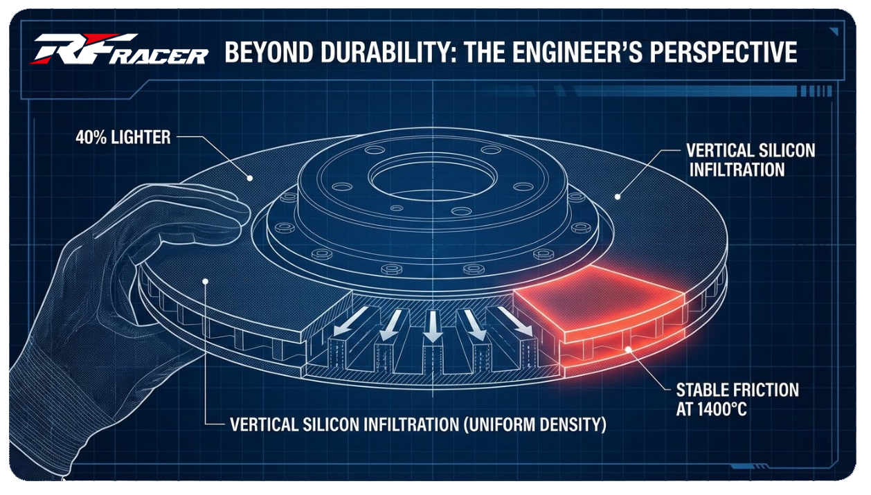 我们利用重力,引导硅液垂直、均匀地渗入盘体。这种工艺虽然对设备要求极高,但它从物理层面保证了盘体各个部位密度的高度一致性。当你以 200km/h 飞驰时,这份从内而外的“平衡”,就是信心的来源。