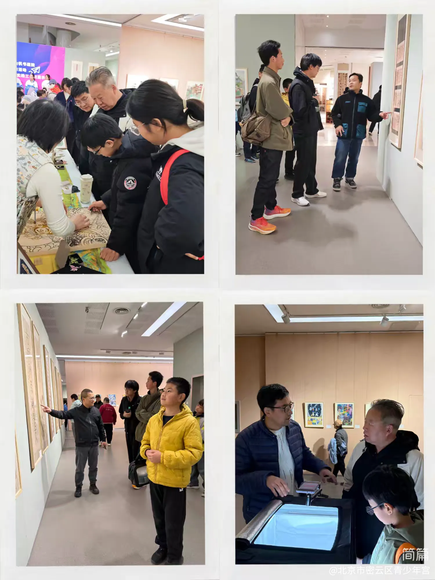 师生参观活动由密云区少年宫组织实施,带队教师包括书法创新班的郭鑫伟、忻冠男老师,美术创新班的李庆军、李海龙老师。师生们共同参观了“北京阳光艺术节艺术作品展”,近距离欣赏了数百幅来自全市中小学书法、美术优秀获奖作品,在艺术氛围中沉浸体验、交流互动、启智润心。