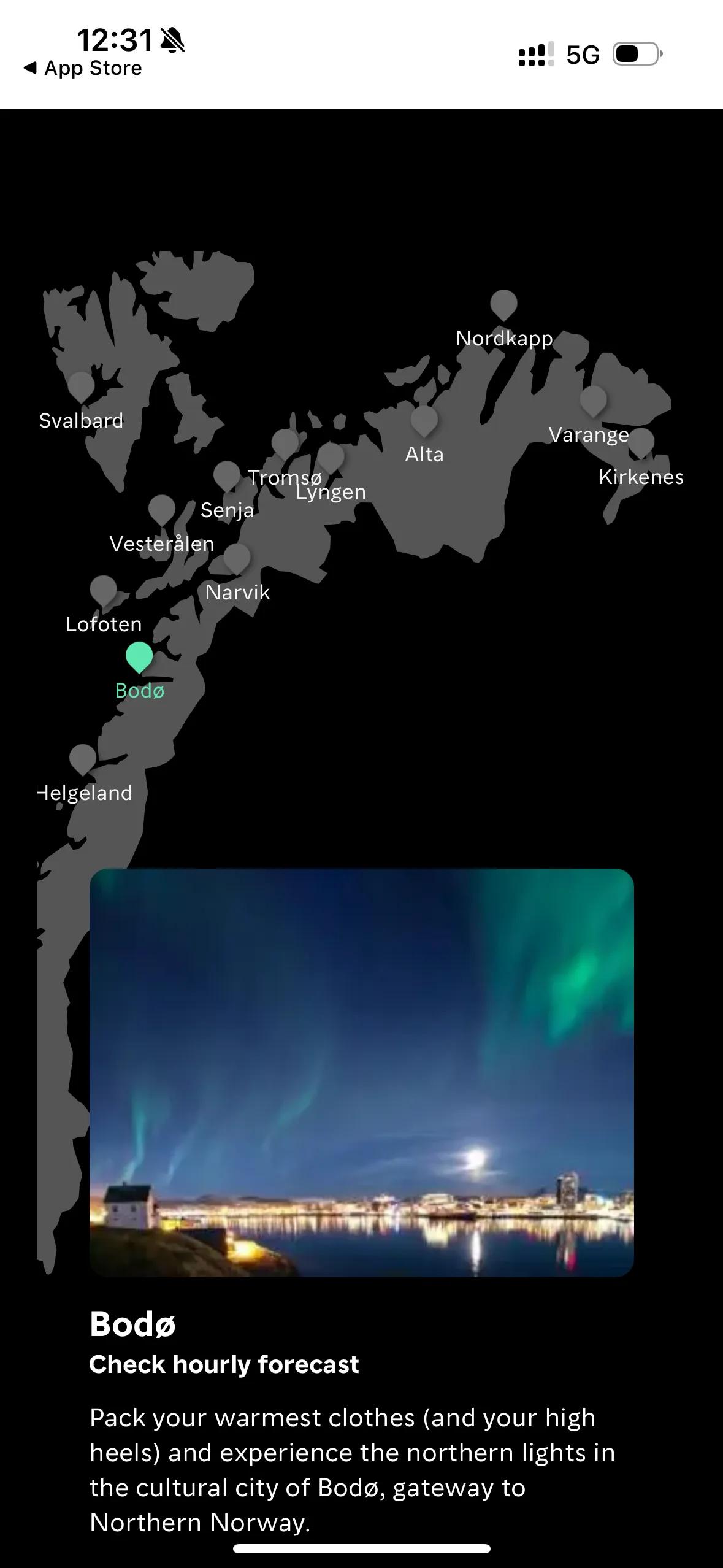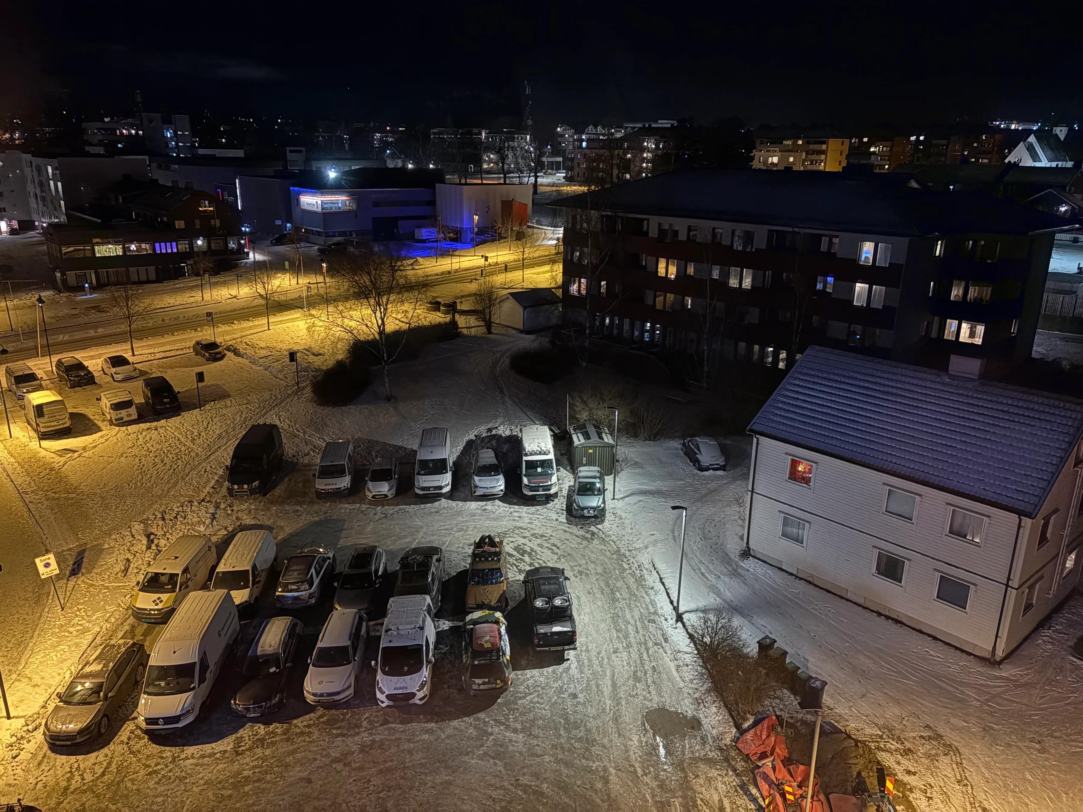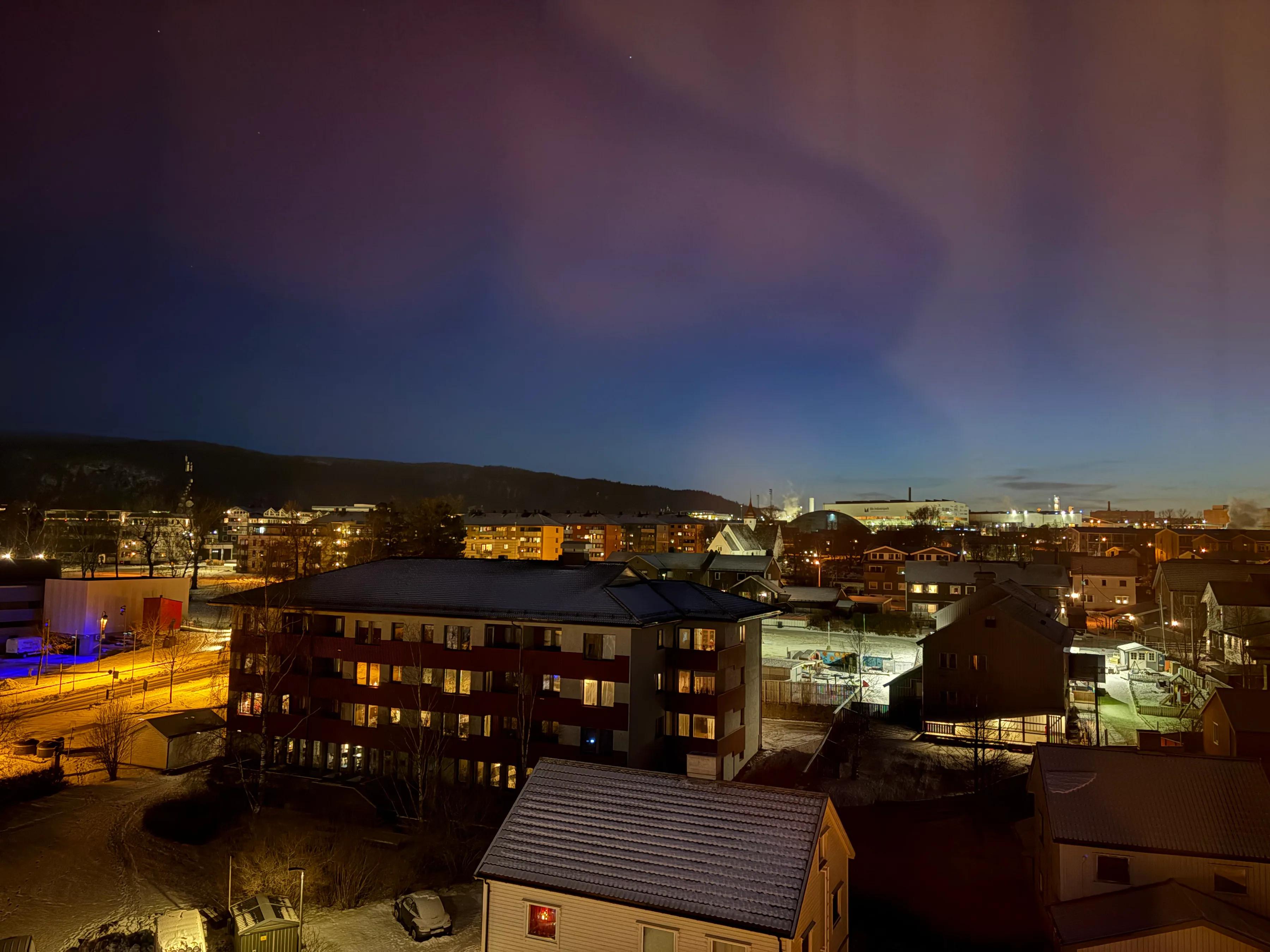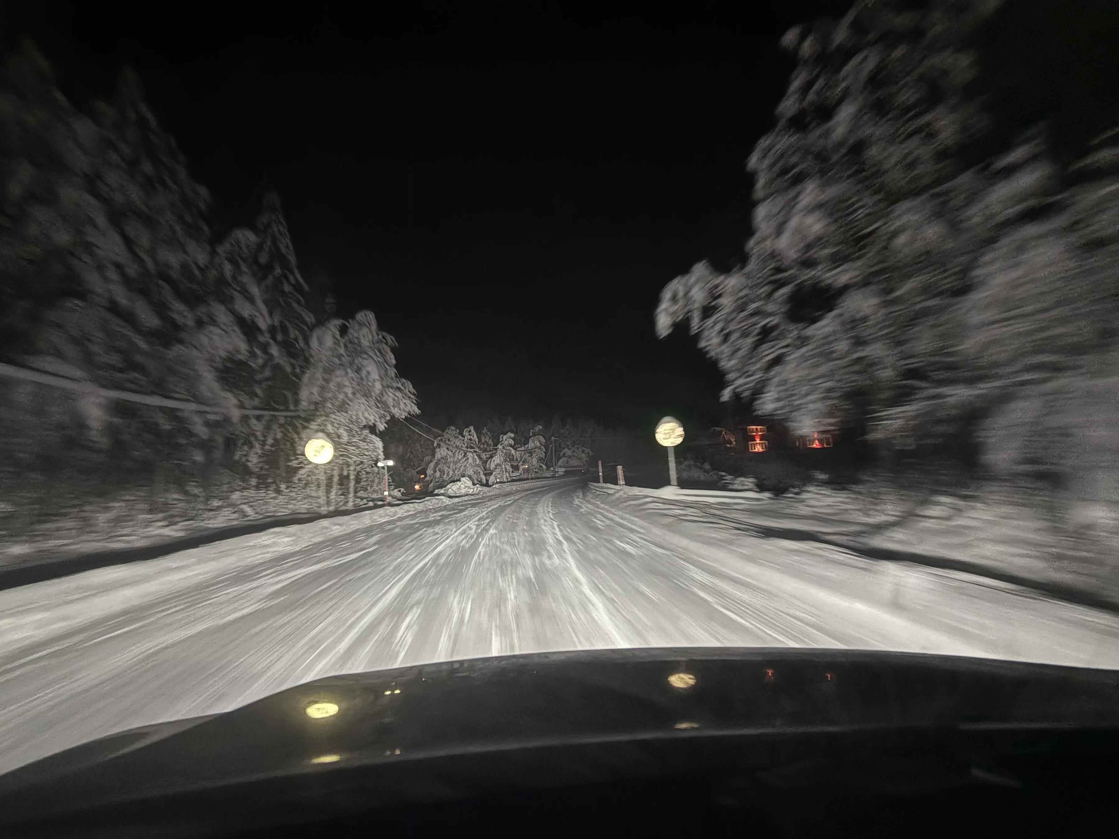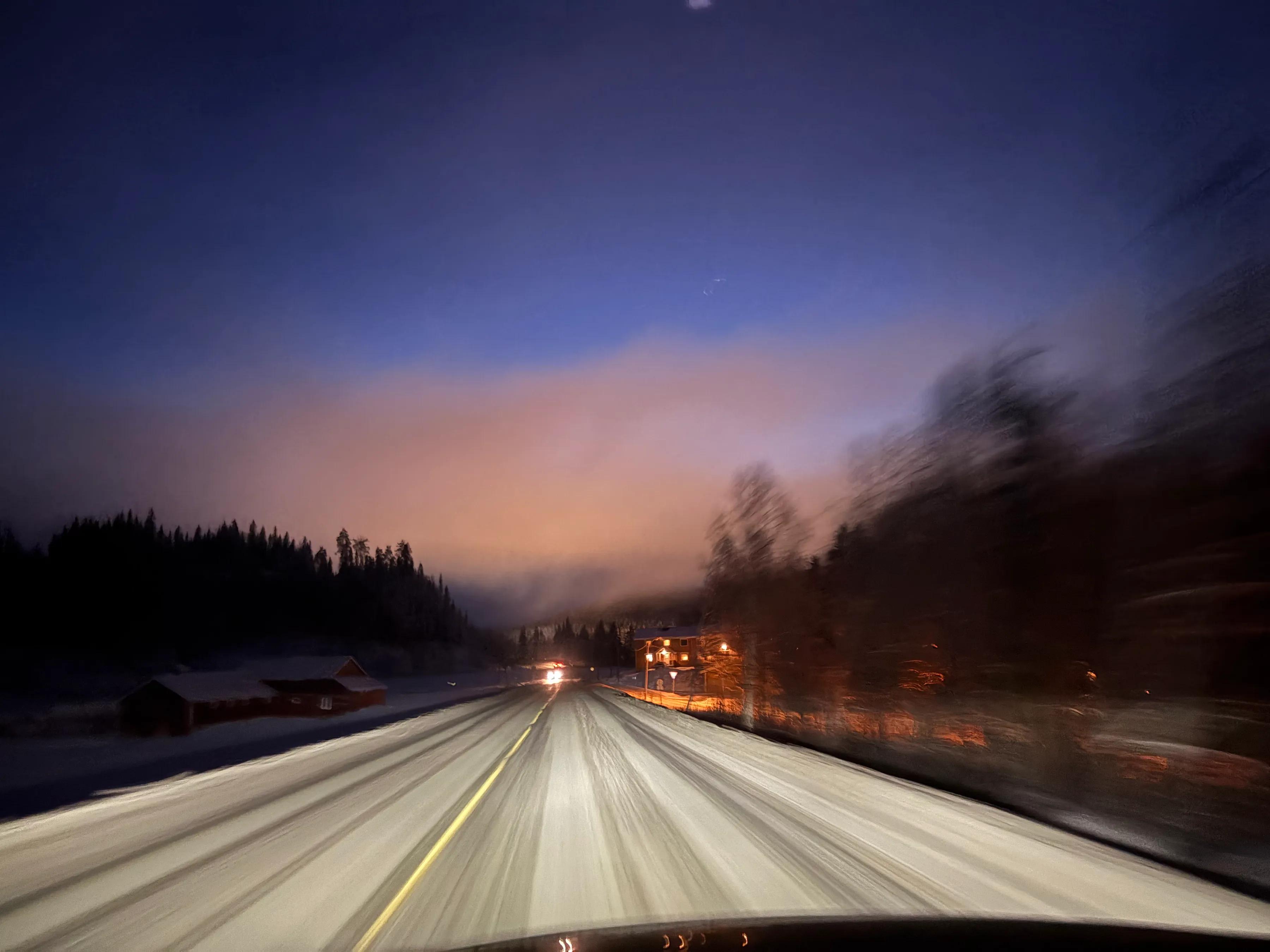 路上时不时还有积雪,我就把车速控制在60-70之间,我自己觉得自己已经开的很快了,但是时不时的还是会被挪威本地车超车。每当要被超车的时候,我就会把自己的车尽量往右靠,给他们留出充足的超车空间,并主动打右转灯。 今天到博德的计划估计不能实现了,我想着就往前走吧,APP上说,今天有百分之四十的几率看到极光。离着北极圈附近的小城摩城还有二三十公里的时候,我突然发现我后面跟着的车变多了,透过后视镜看大约四五辆本地车在我后面,最后的车还是一个闪着蓝灯的。