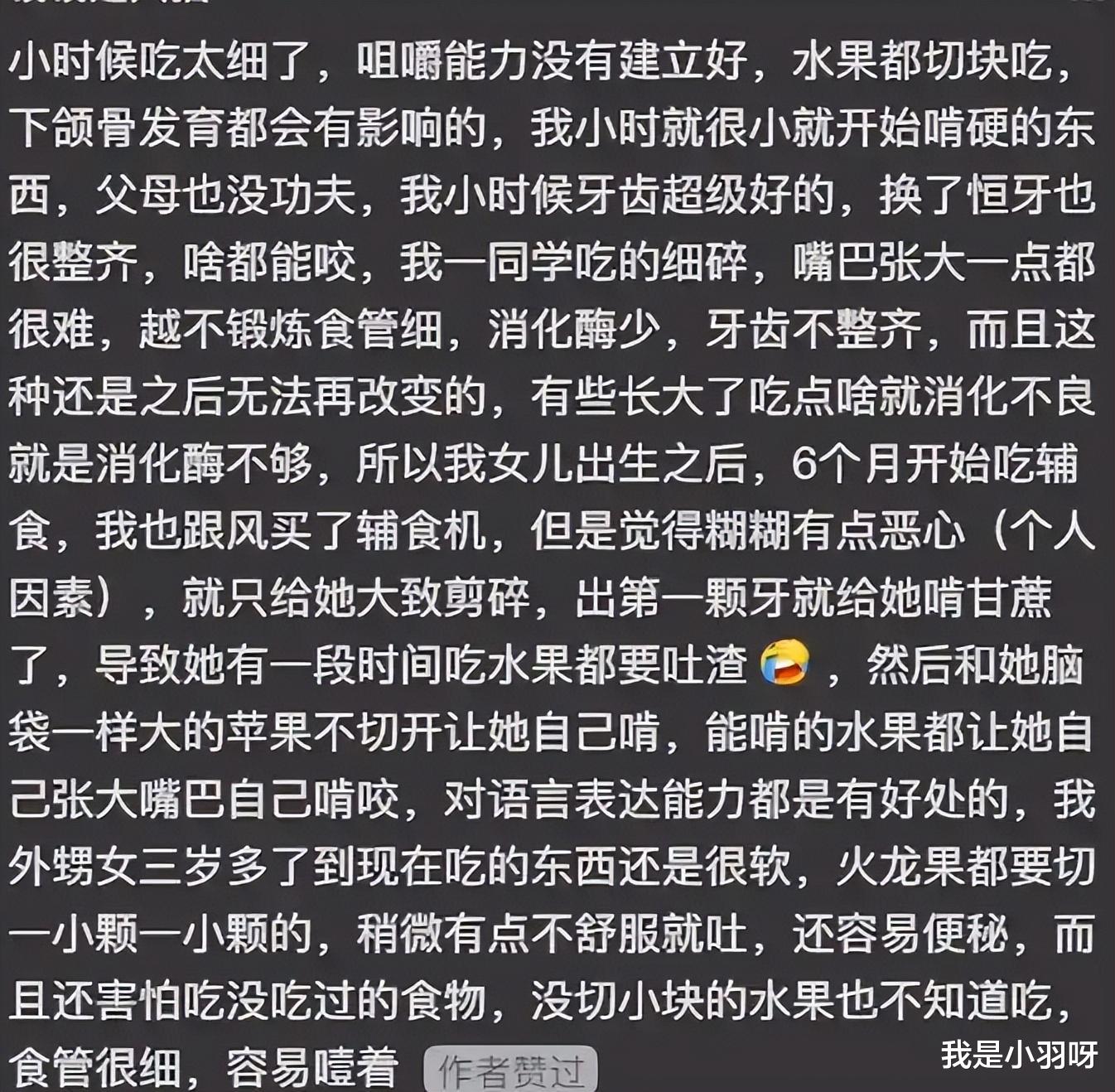 可现在身边的孩子,菜要打成泥,肉要剁成蓉,水果切成小丁,面包泡软了喂。这届父母太“爱”孩子,孩子上小学了可能还不会完整咬断香蕉,吃炸鸡嚼几口就吐,不是不爱吃,是嚼不动。