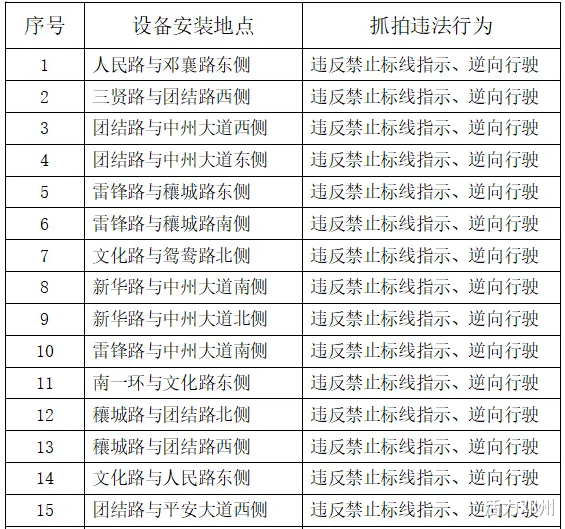 为进一步规范道路交通秩序,预防和减少道路交通事故的发生,根据《中华人民共和国道路交通安全法》《道路交通安全违法行为处理程序规定》《非现场查处道路交通安全违法行为操作规程(试行)》等法律法规,邓州市公安局交通管理大队在部分路口路段(安装位置明细附后)新增并启用交通技术监控设备,对交通违法行为进行拍摄取证并依法处罚,现予以公示。