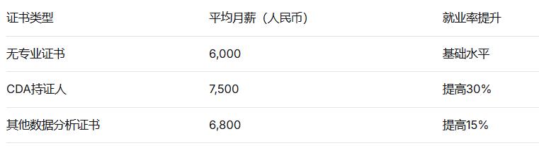 薪资提升显著:根据权威调查,CDA持证人平均薪资比非持证人高出约25%。下表展示了相关数据对比: