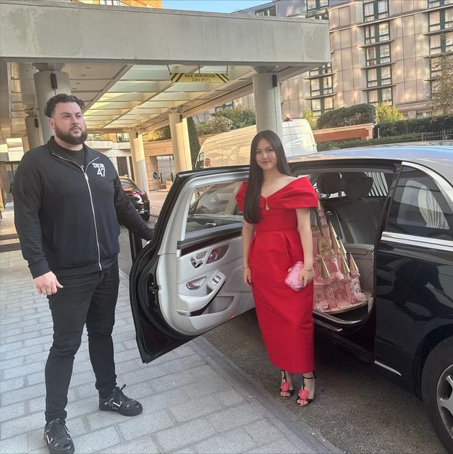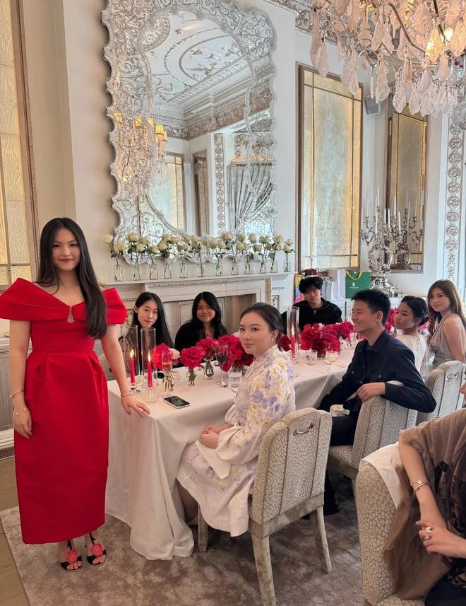 王诗龄这天是绝对的主角,穿得也是格外的醒目,一件红色露肩长度到了脚踝,黑色高跟鞋上的红花和裙子颜色相匹配。她拿着芭比粉的手拿包和身后的城堡蛋糕颜色也是相匹配。王诗龄站在车门前,有国外的工作人员为其开门,站在那就是一副名媛大小姐的模样。
