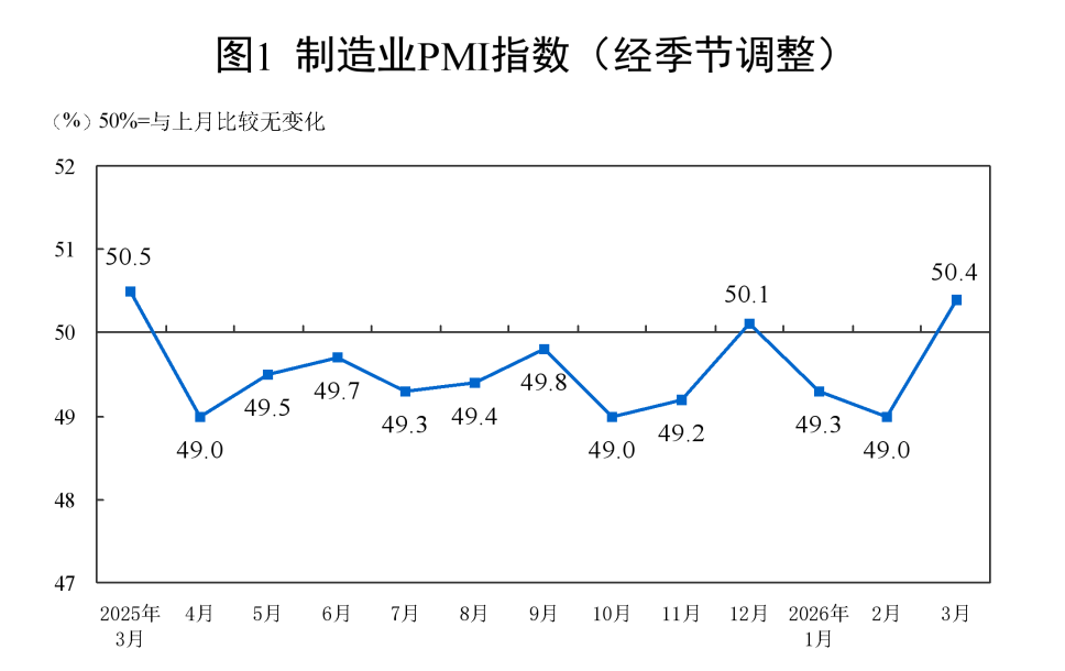 从企业规模看,大型企业PMI为51.6%,比上月上升0.1个百分点,高于临界点;中、小型企业PMI分别为49.0%和49.3%,比上月上升1.5个和4.5个百分点,低于临界点。从分类指数看,构成制造业PMI的5个分类指数中,生产指数和新订单指数均高于临界点,原材料库存指数、从业人员指数和供应商配送时间指数均低于临界点。这是今年第一次冲上50的荣枯线,不过三月是春节后刚开工,后面还需要再观察……