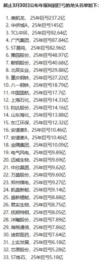 截至3月30日披露的数据,33家公司2025年交出了巨亏的成绩单,其中18家亏损超过10亿,最惨的一家亏了237亿。光伏、汽车、地产、钢铁……这里面好多原来的的白马,现在都成了过气的黄花了……