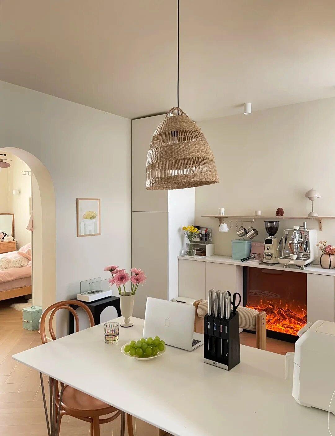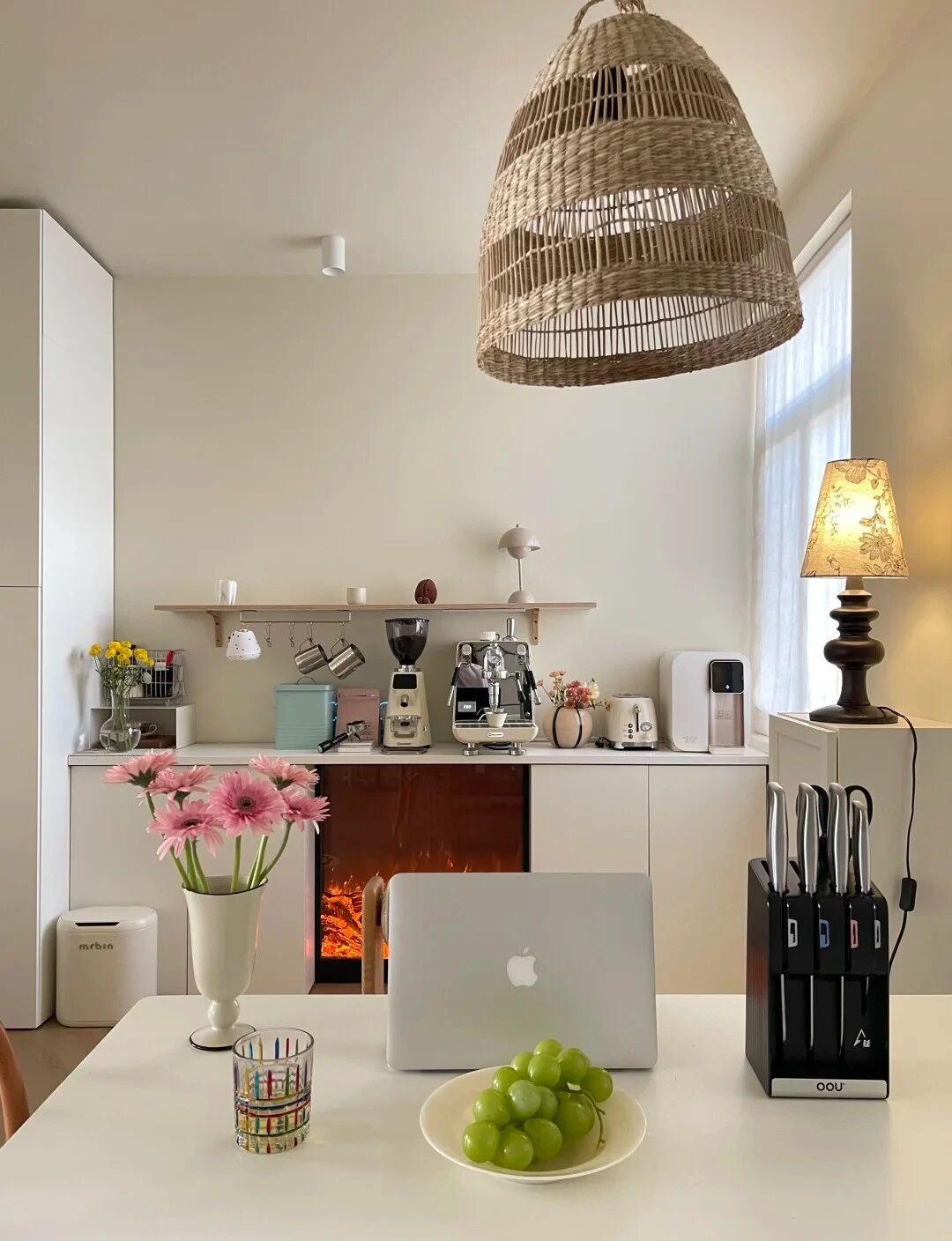 而原本的小次卧,博主就将它改成了餐厅,靠墙放了一组3米餐边柜,超大的台面,可以收纳各种小家电,还留出一个咖啡角,在家也可以享受醇香的咖啡下午茶时光;
