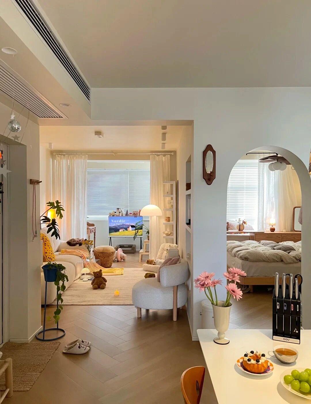 墙壁选择了蛋壳光乳胶漆,统一全屋色调,基本上没有做石膏线,也没有挂装饰画,但是因为这温润的色系,看起来真的很温柔;