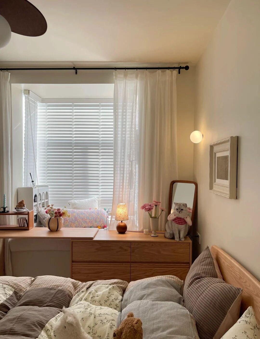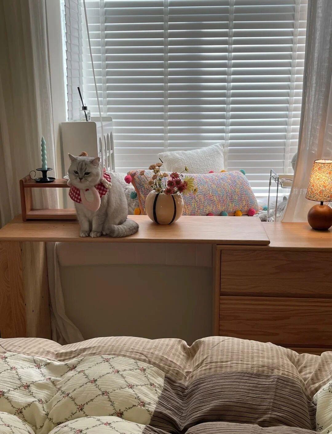 对面就是飘窗,也被博主布置成猫咪的专属休憩区,搭配木百叶,过滤出柔和光线,闲坐转角,恬静自得,真的很自在;