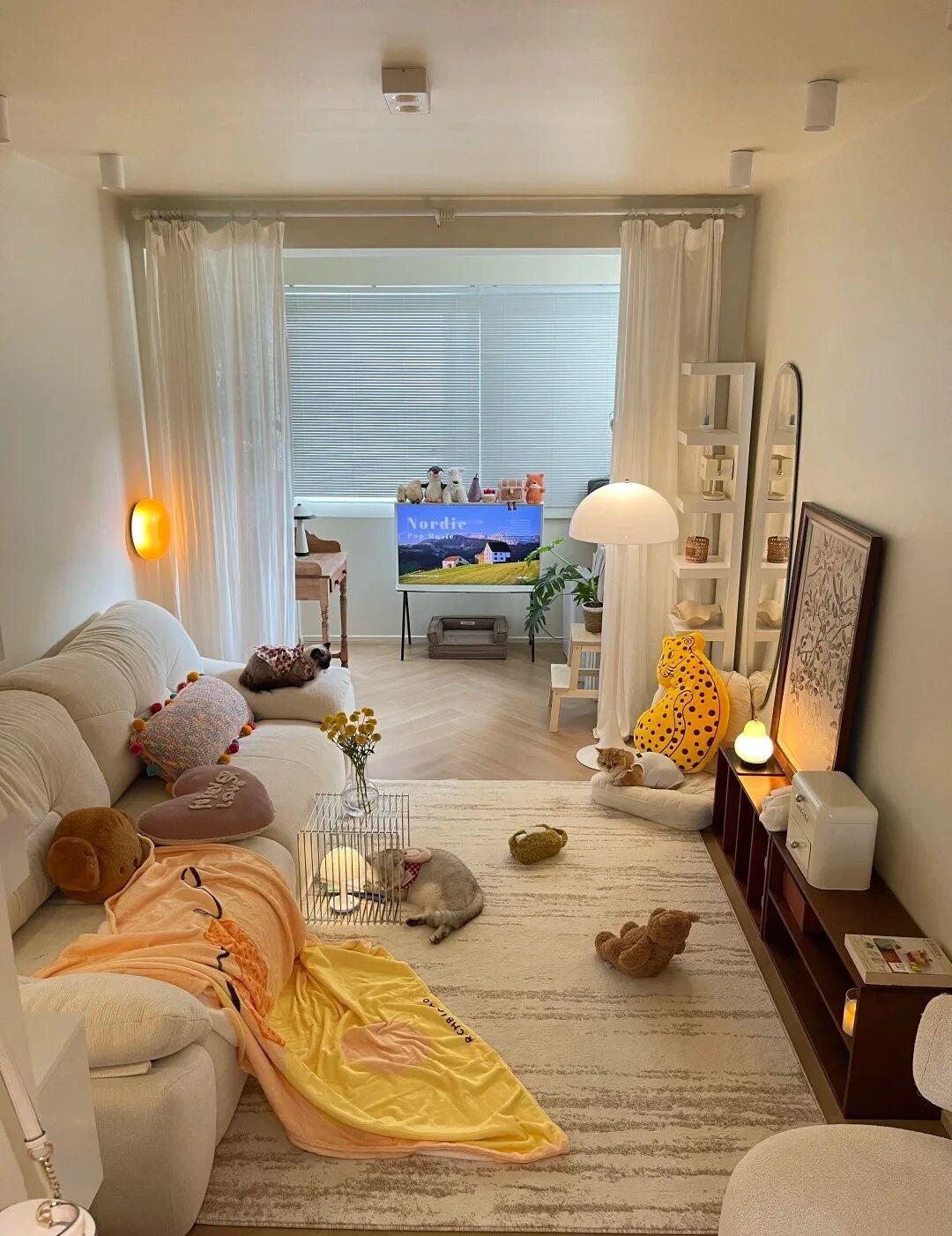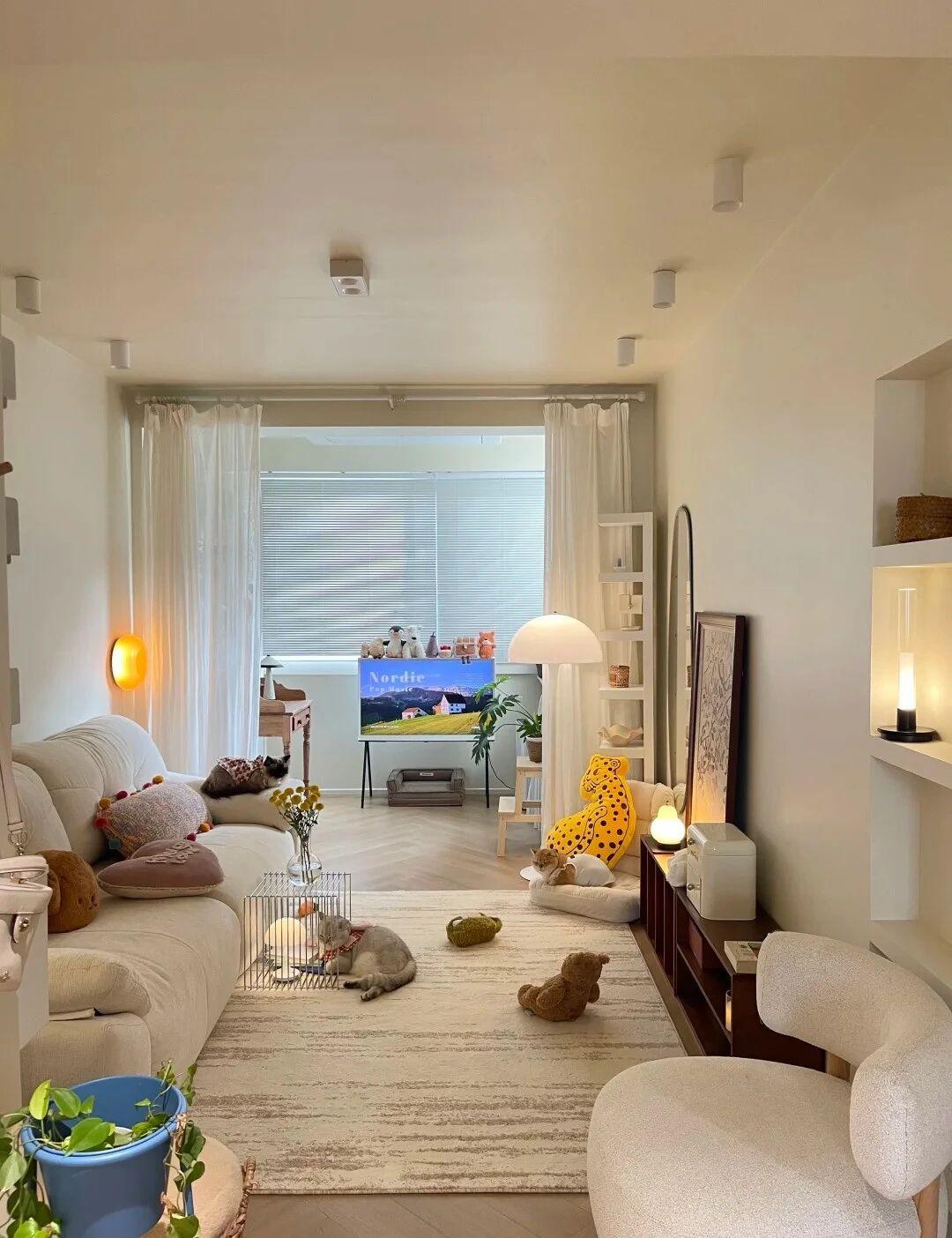 但是,为了划分功能区,博主直接在客厅中央铺上地毯,靠墙加了组沙发,而正对面就布置了一个支架电视,搭配落地灯营造氛围;