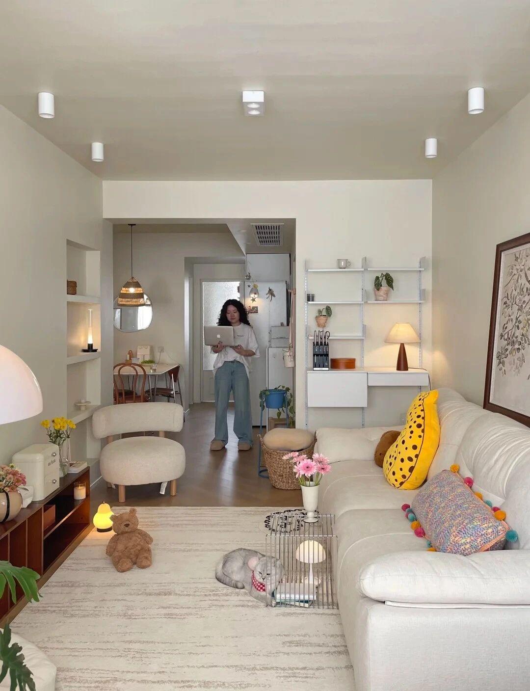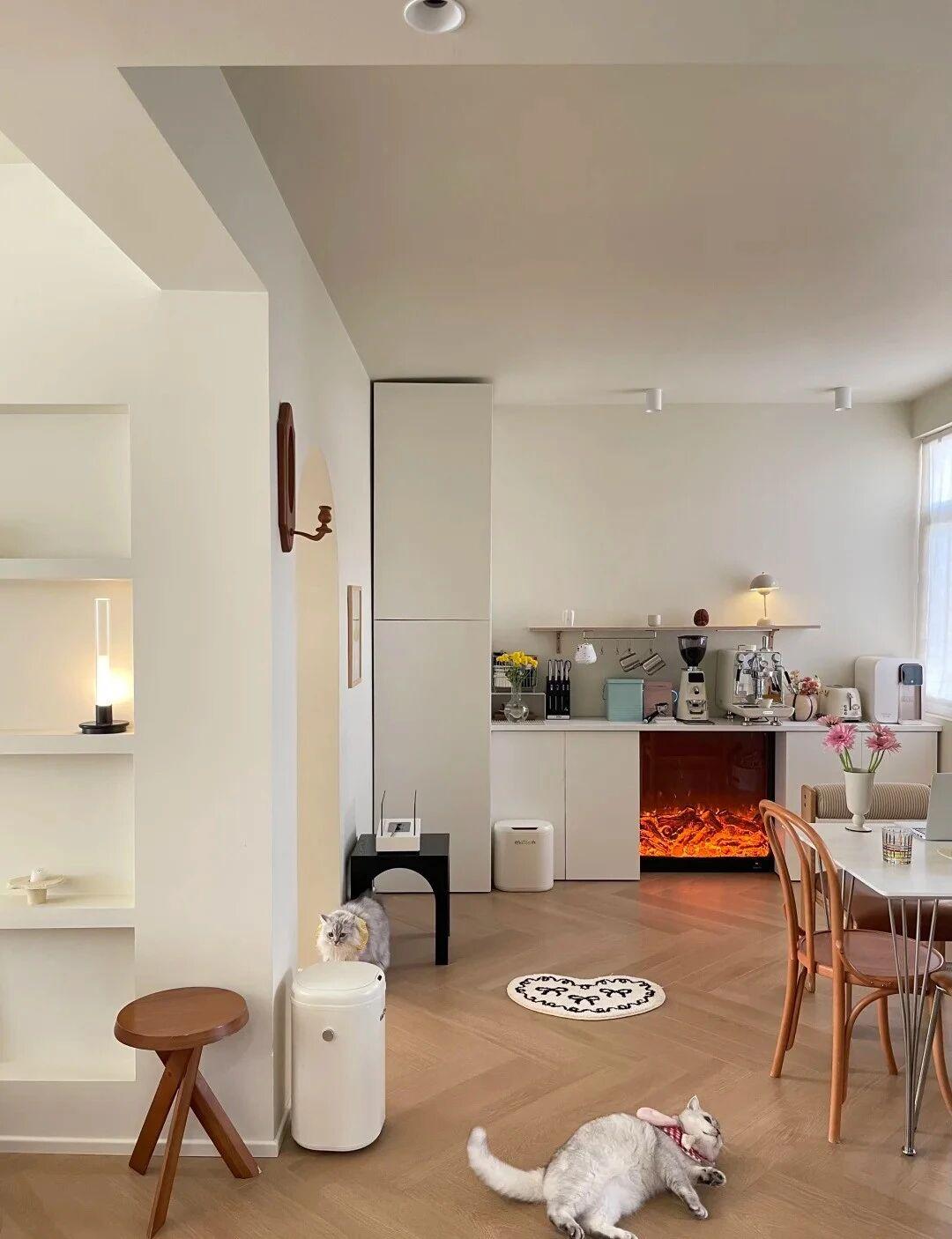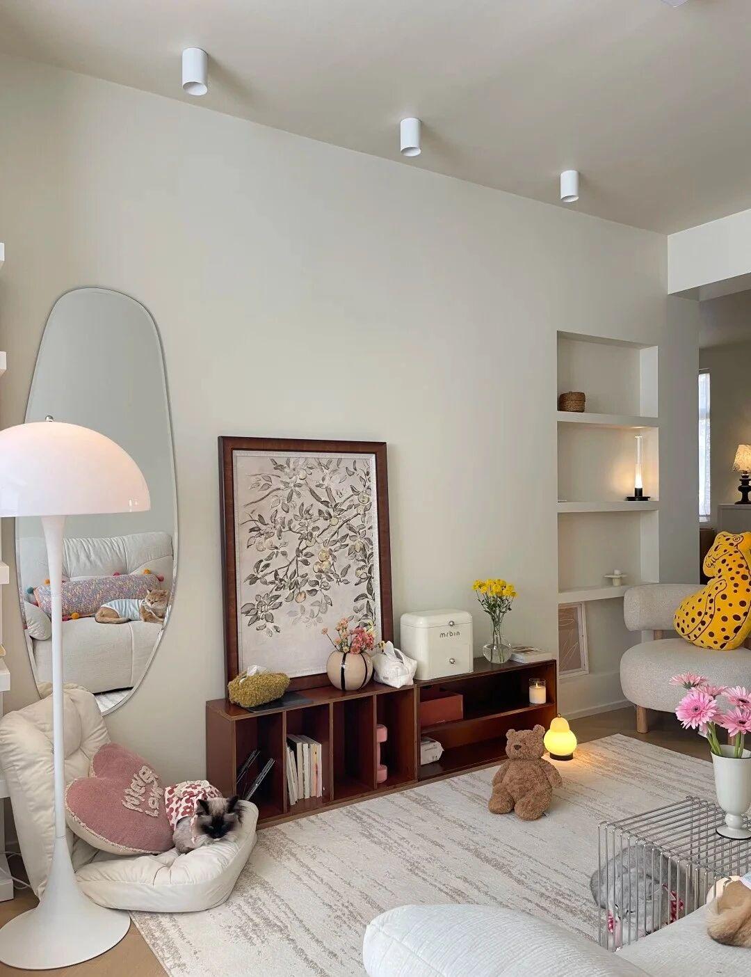 博主喜欢养好,看到猫咪爬架,也让她有了灵感,在客厅侧面,利用石膏板做了了一个不规则浅壁龛、置物架,增添立体层,还多了展示空间。
