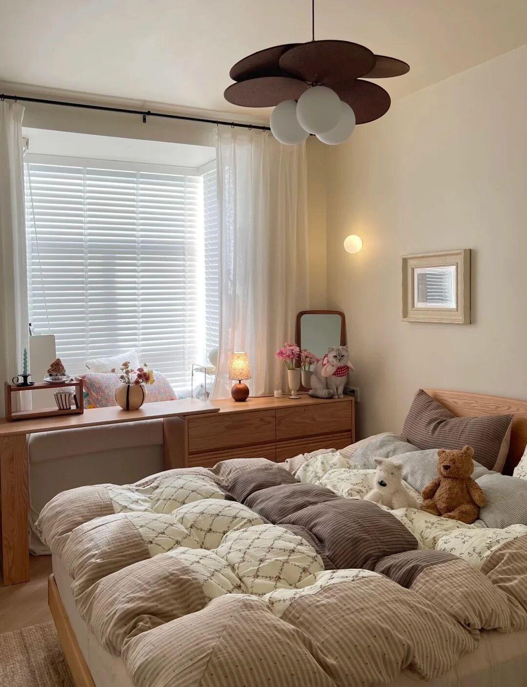 最里侧就是卧室了,中间放置一张实木床,对面放置了六斗柜和梳妆台,小物件都可以放置在里面;