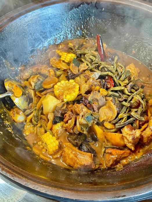 柴火炖鸡肉质紧实,炖得软烂入味,贴饼子吸满鸡汤,外酥里软,玉米饼香甜,搭配土豆干,是地道的农家味。