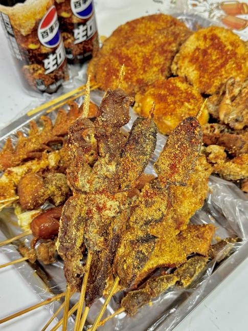腐皮卷炸至金黄,刷甜咸秘制酱料,里脊肉串鲜嫩,淀粉肠外酥里嫩,炸金针菇吸满酱汁,是地道的街头味道。