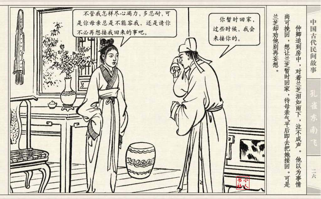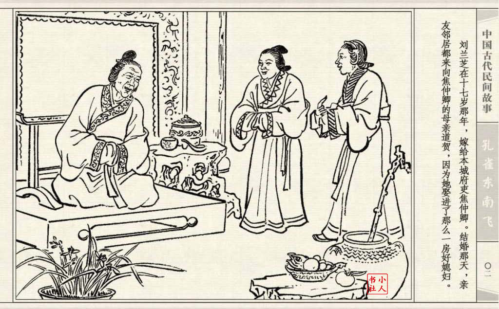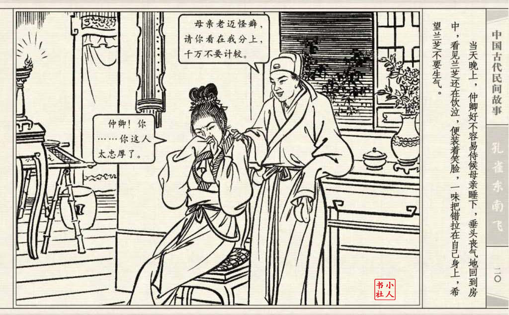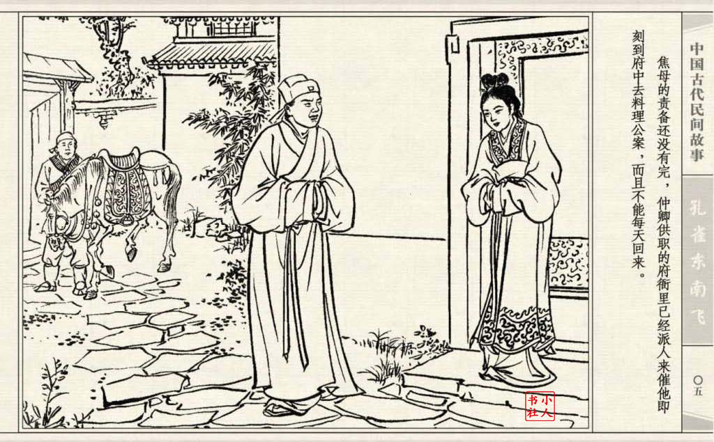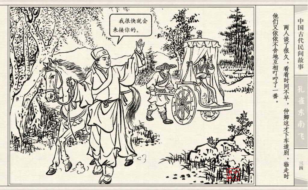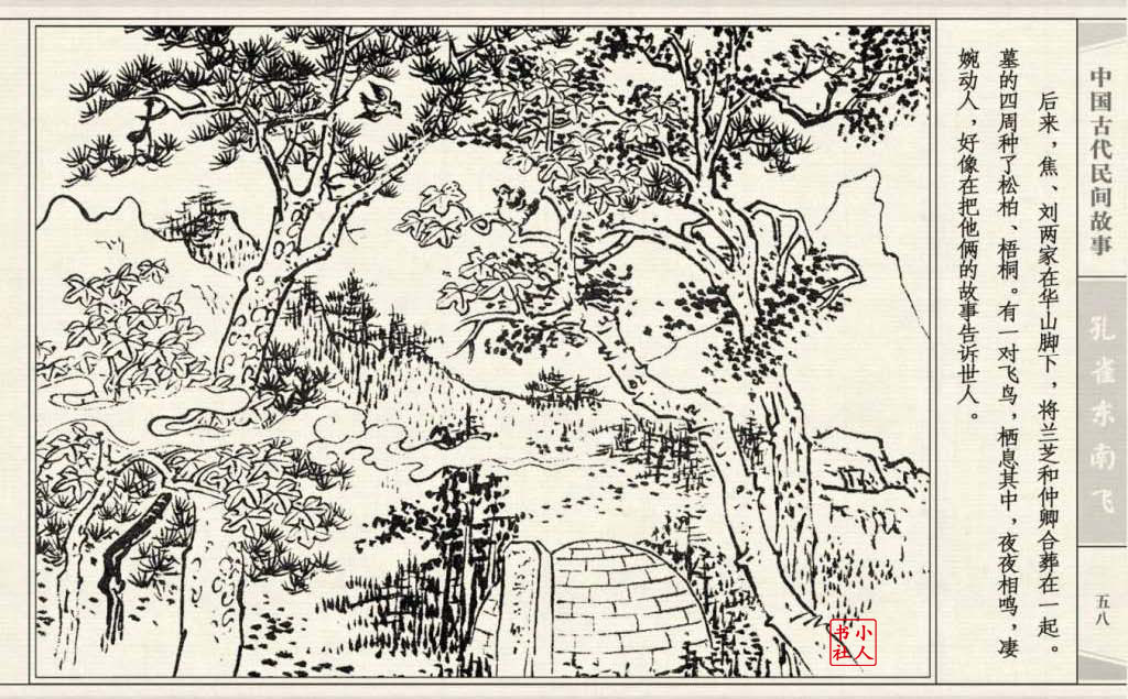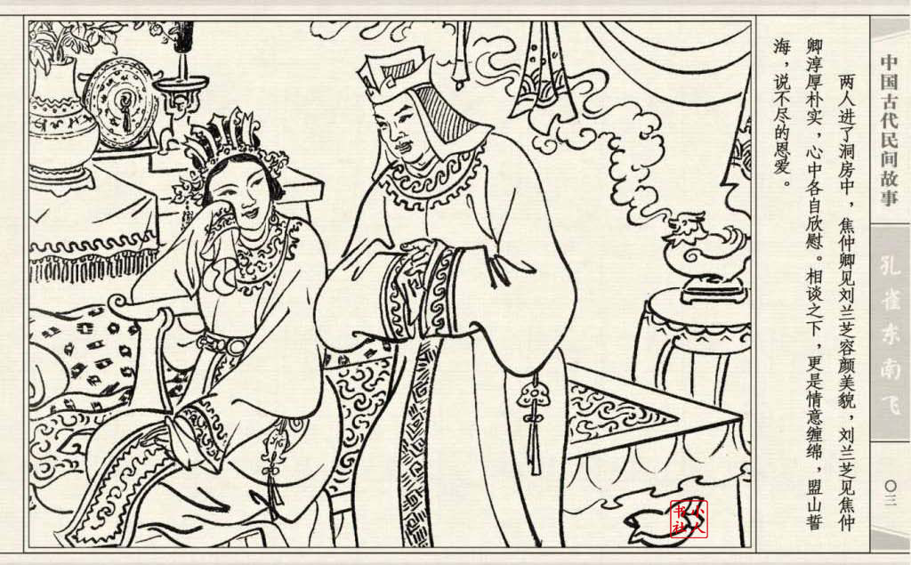 《孔雀东南飞》连环画是由东方羽编文,董天野绘画。这本连环画是根据古诗“孔雀东南飞”改编的。故事发生在汉朝末年,庐江府小吏焦仲卿娶妻刘兰芝,两人情爱弥笃,相处甚好。但是仲卿的母亲生性专横,刻意虐待媳妇,最后竟专断地将兰芝休了。兰芝回家后,