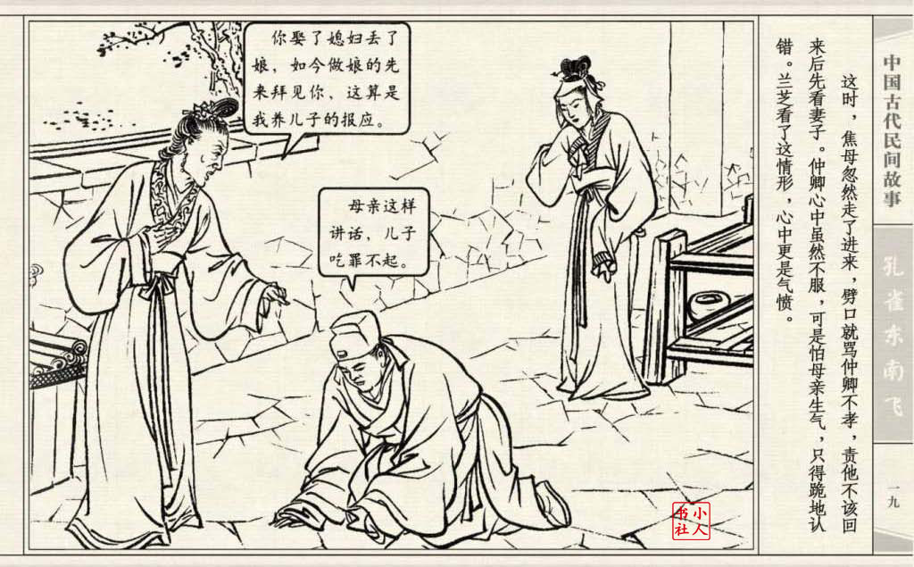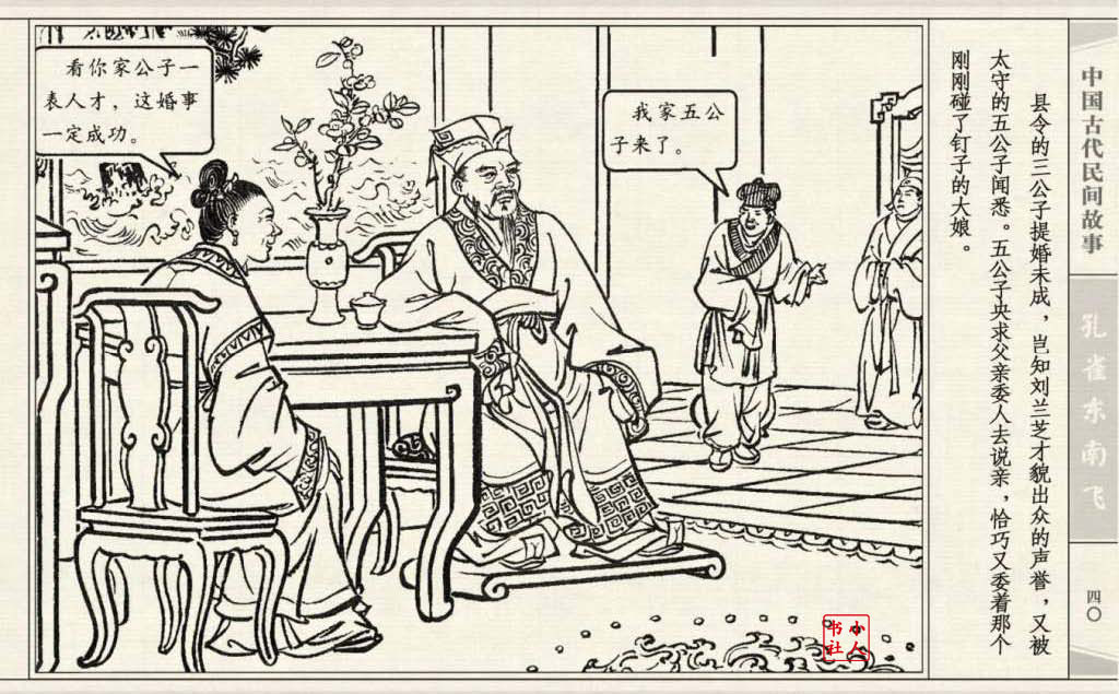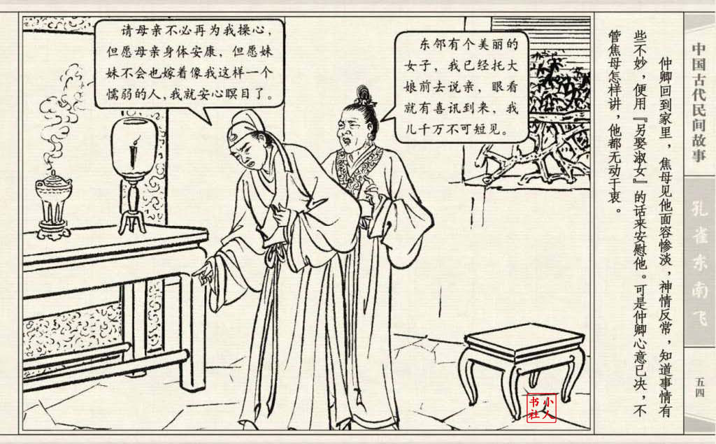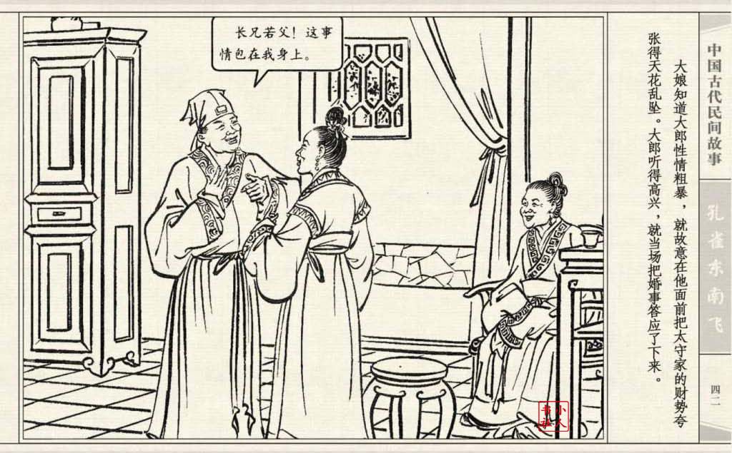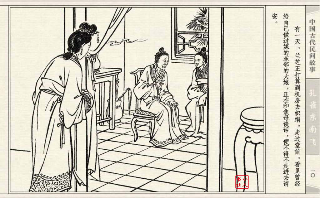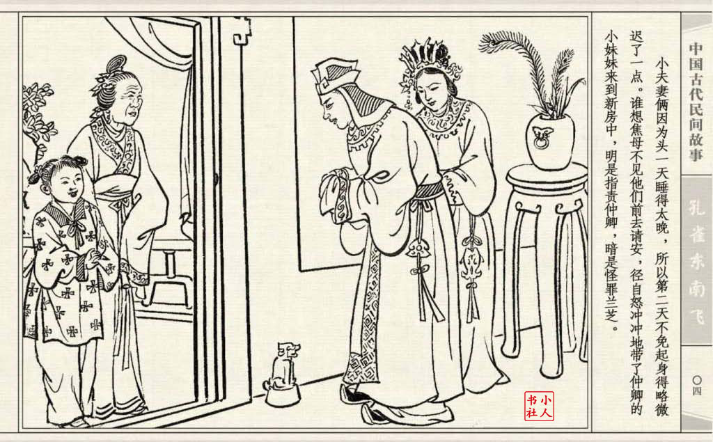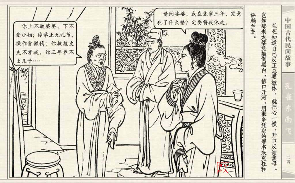 《孔雀东南飞》连环画是由东方羽编文,董天野绘画。这本连环画是根据古诗“孔雀东南飞”改编的。故事发生在汉朝末年,庐江府小吏焦仲卿娶妻刘兰芝,两人情爱弥笃,相处甚好。但是仲卿的母亲生性专横,刻意虐待媳妇,最后竟专断地将兰芝休了。兰芝回家后,