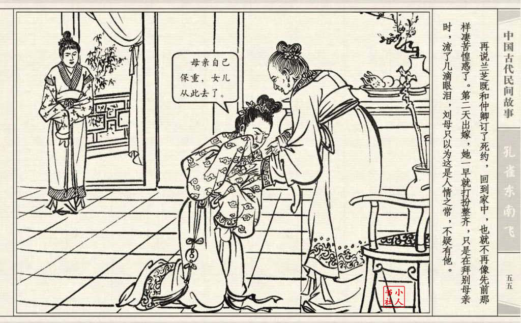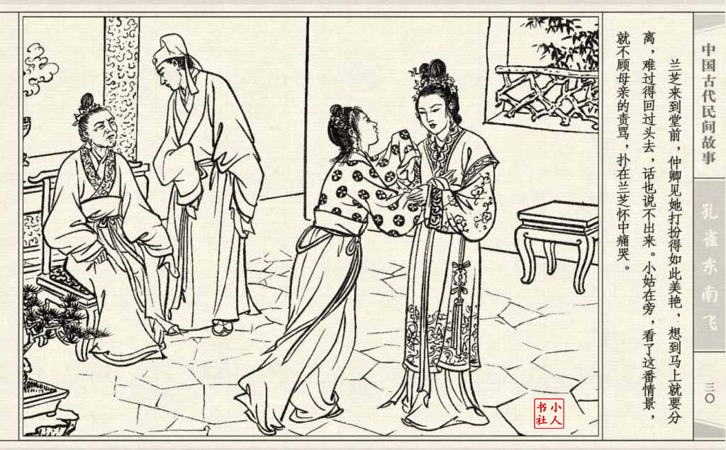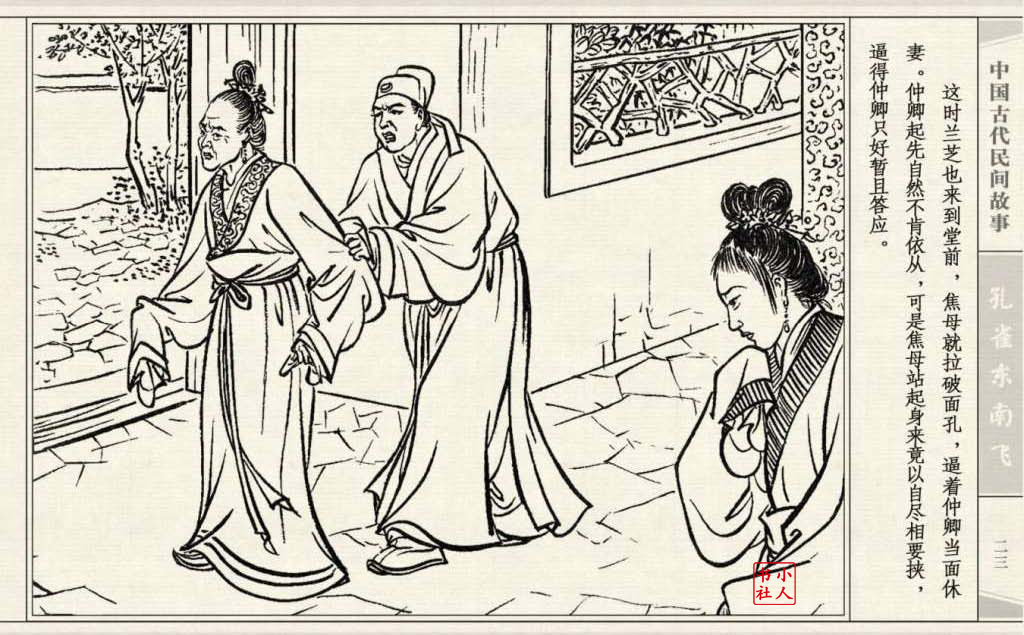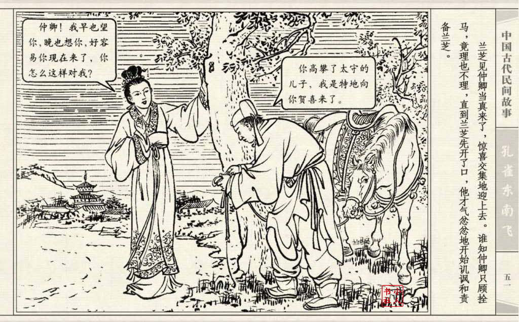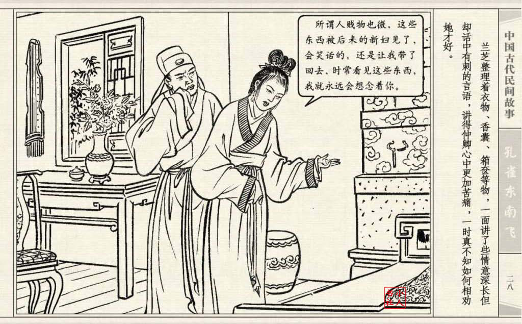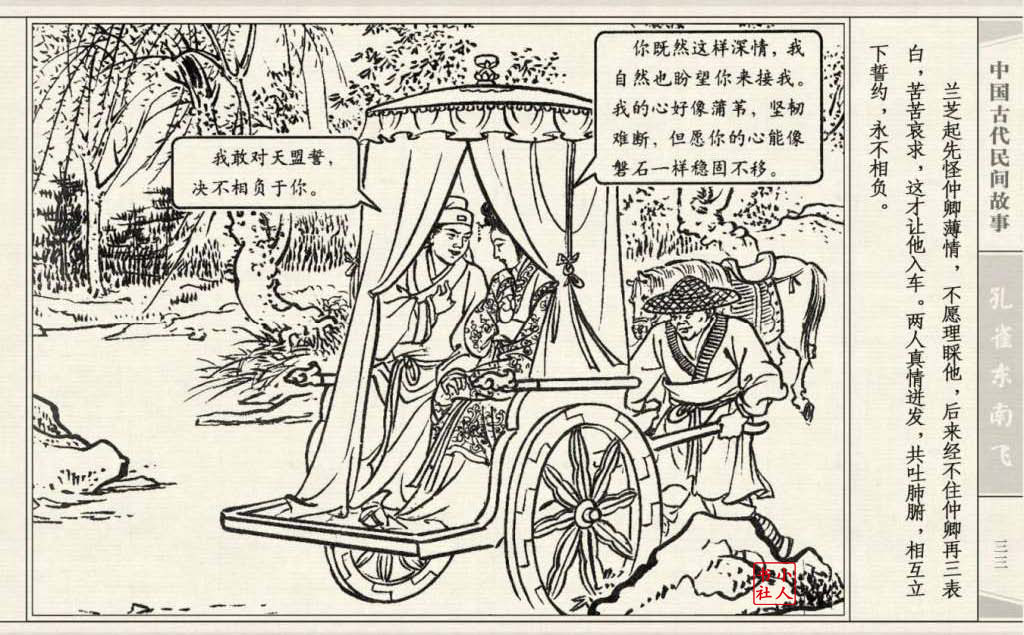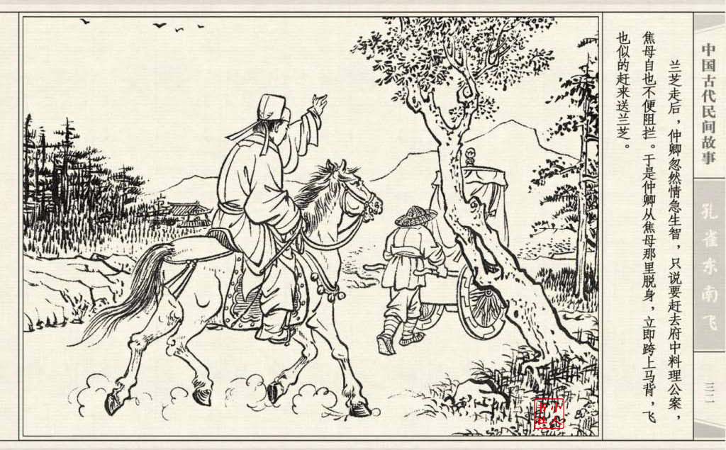 其兄贪图财势,逼她改嫁太守之子。面对封建婚姻的迫害,兰芝在再婚的那夜投水自尽:仲卿也自缢而死。